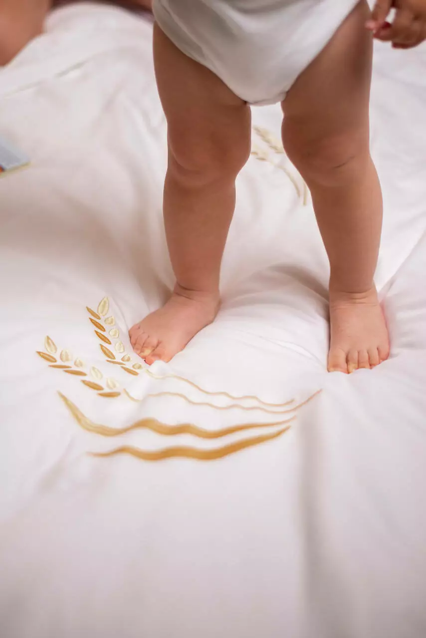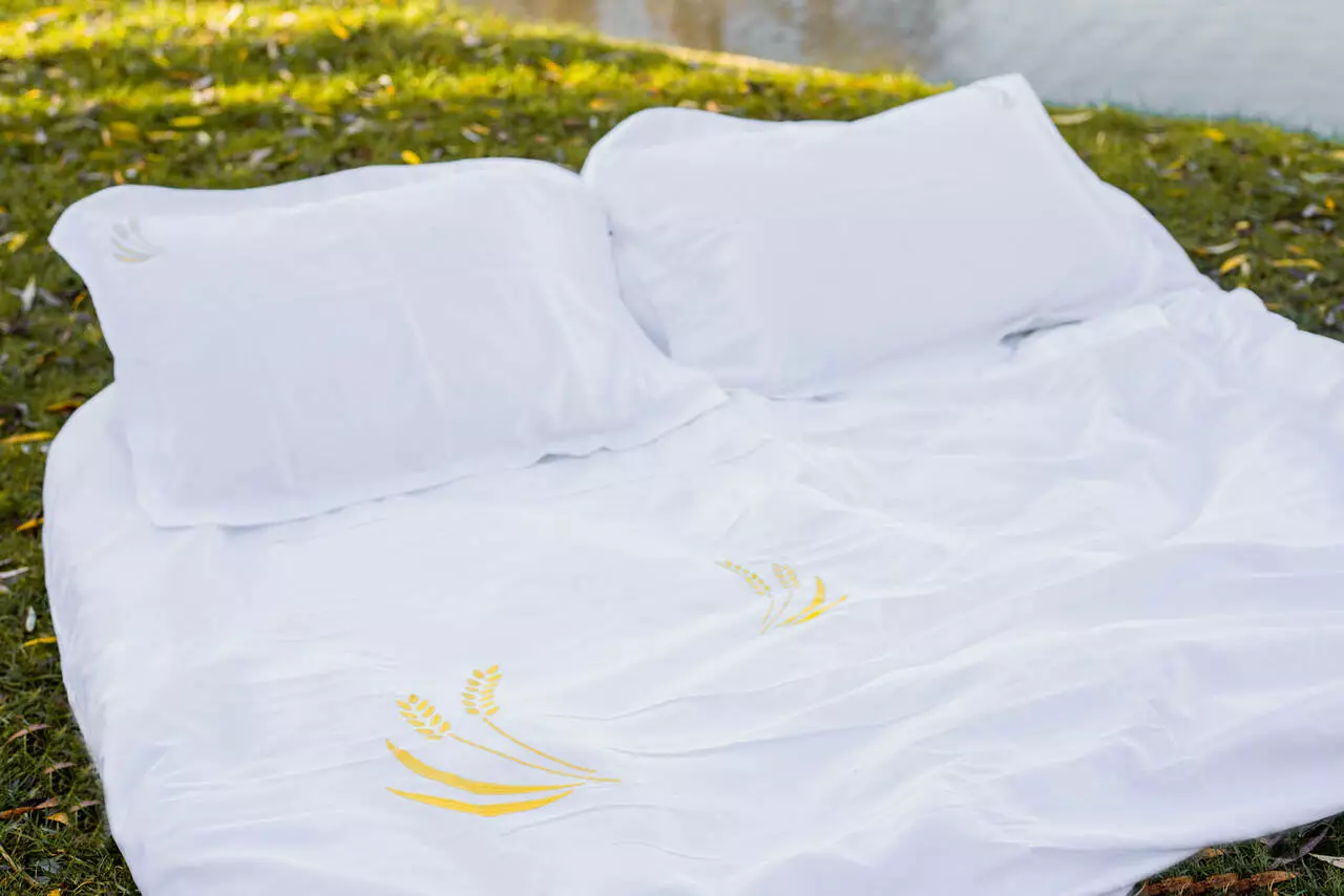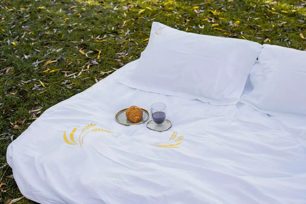 Білий колір постільної білизни асоціюється з подорожами та готелем, але в той же час тендітна вишивка колоску додає відчуття затишку та дому.