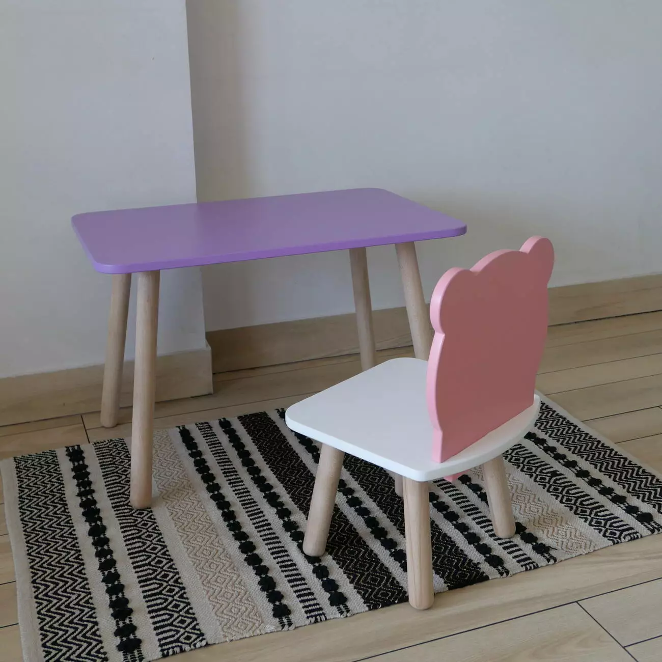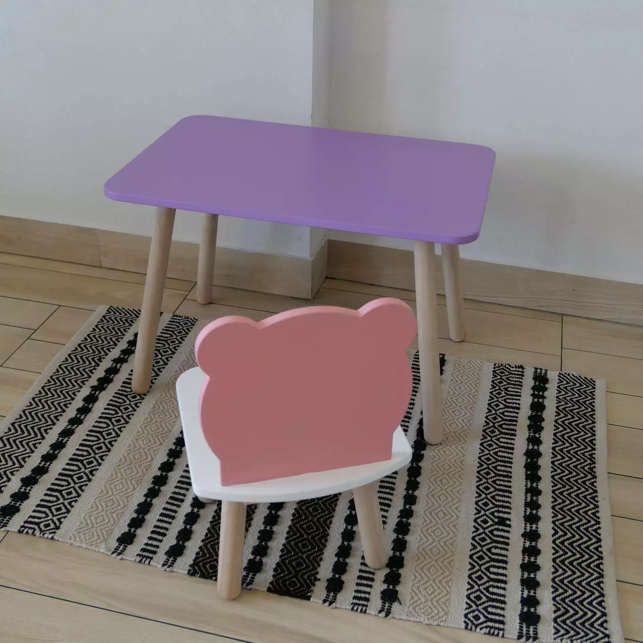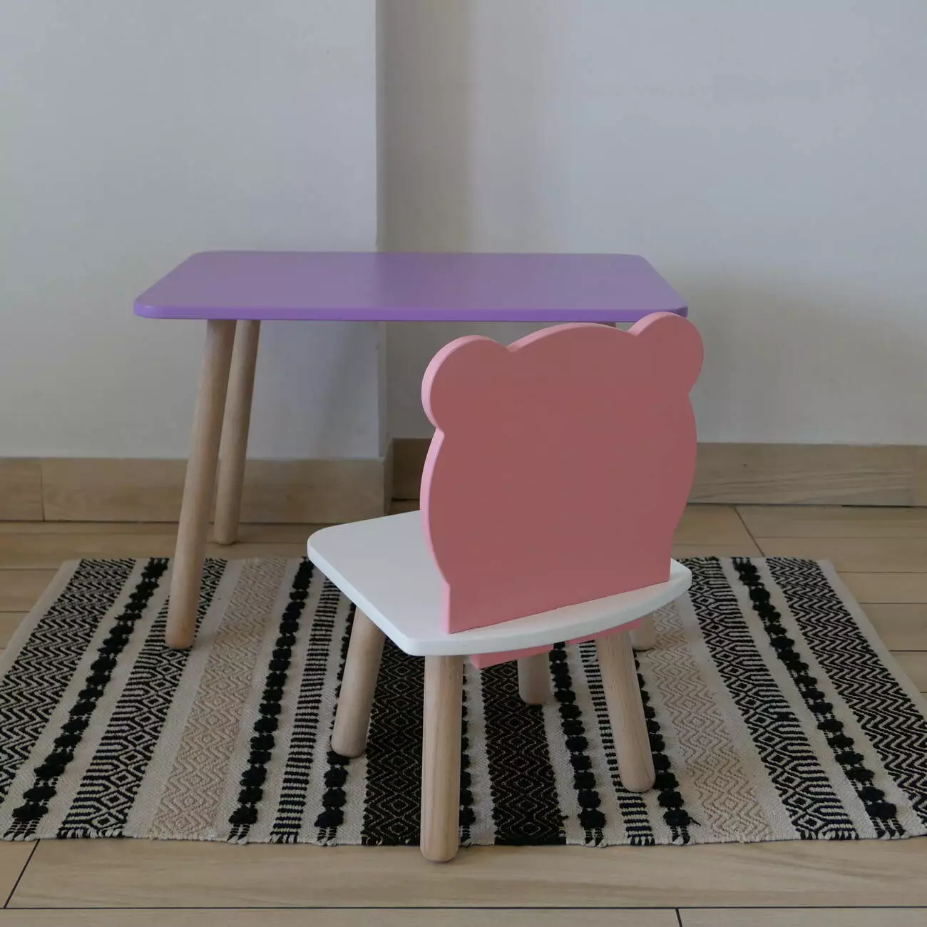 Комплект стіл та стул дитячий ChildWood - Set Стіл бузковий прямокутний + стілець білий рожевий Ведмедик (Фанера)