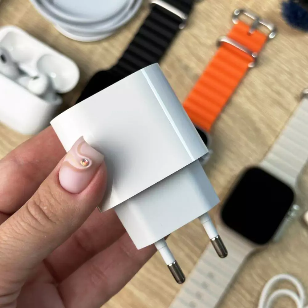 є блок живлення, і всі необхідні кабелі для зарядки всіх гаджетів.