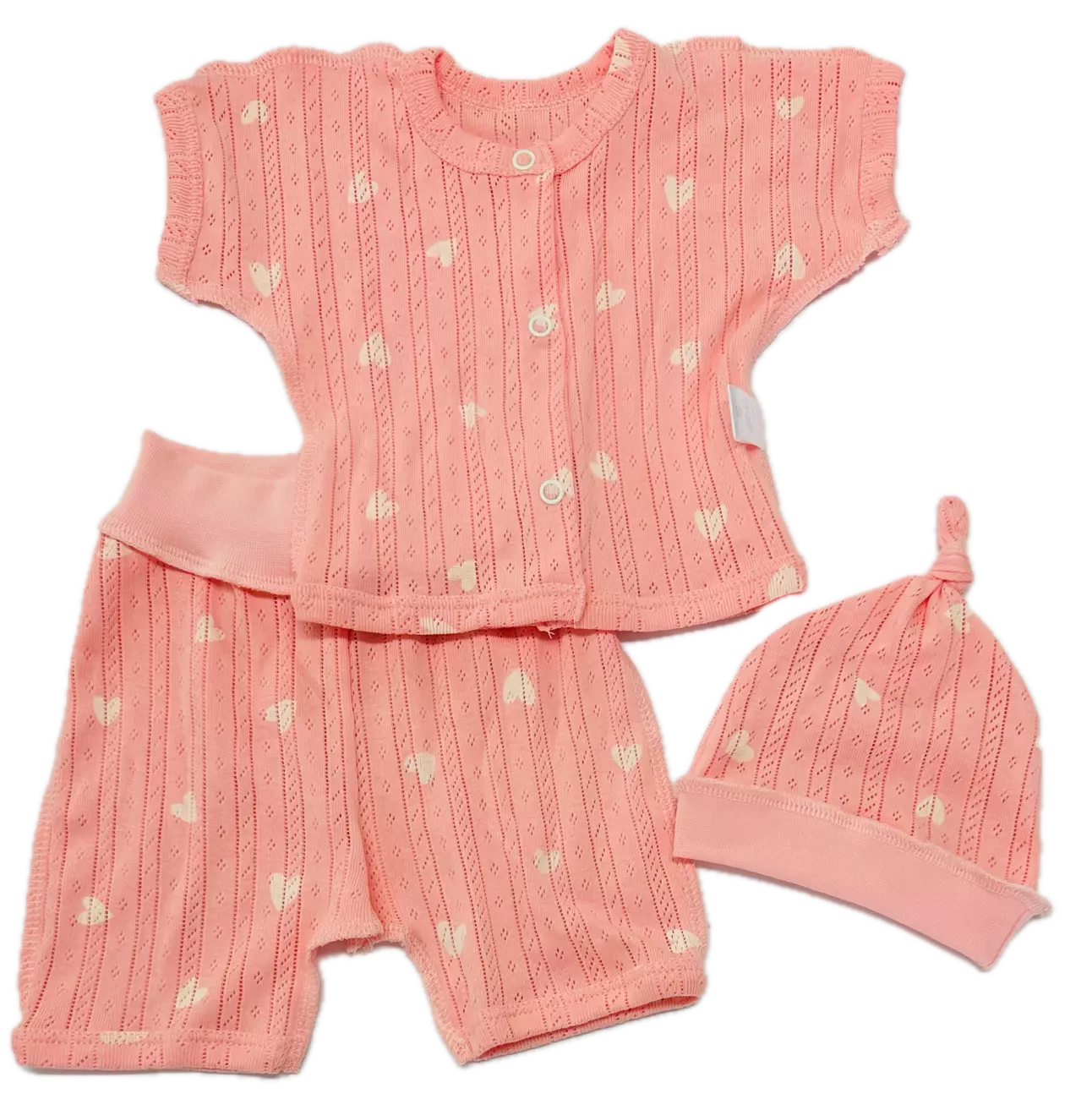 Комплект ясельний: льоля з коротким рукавом, штанці вкорочені, шапочка. Полотно - ажурний ластик, бавовна 100%