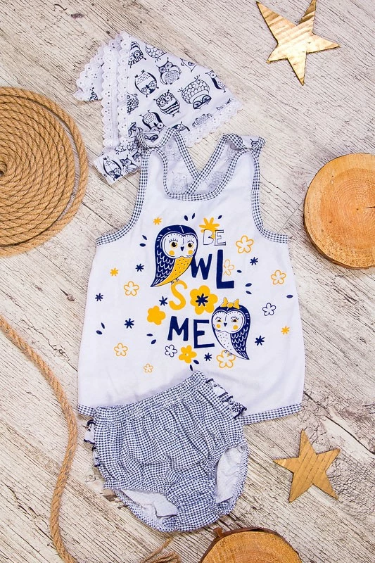 Модна модель для самих маленьких - ясельний комплект для дівчаток. Виконаний з куліра (однотонної і набивної). Головним її достоїнством є високі гігієнічні властивості. Одяг з такого матеріалу відмінно пропускає повітря, вбирає вологу. Кофта вільного крою, спереду прикрашена яскравим накатом, на плечах застібається на кнопки, на спинці полотно лягає на хрест і виглядає дуже красиво. Трусики на комфортній резинці, ззаду доповнені рюшами. Косинка на зручній резинці. Виріб завжди практичний, актуальний і універсальний. Модель призначена для носіння на свіжому повітрі в літню пору. Якість матеріалів бездоганна, бавовна відрізняється своїми натуральністю, приємлимістью для шкіри і хорошою стійкістю до зносу. Догляд: прання при температурі 30 градусів, без попереднього замочування. Вироби з принтом перед пранням необхідно вивернути на виворітний бік, барабанна сушка заборонена; прасувати при t не більше 110С; з вивороту; при пранні не змішувати з іншими типами тканин.