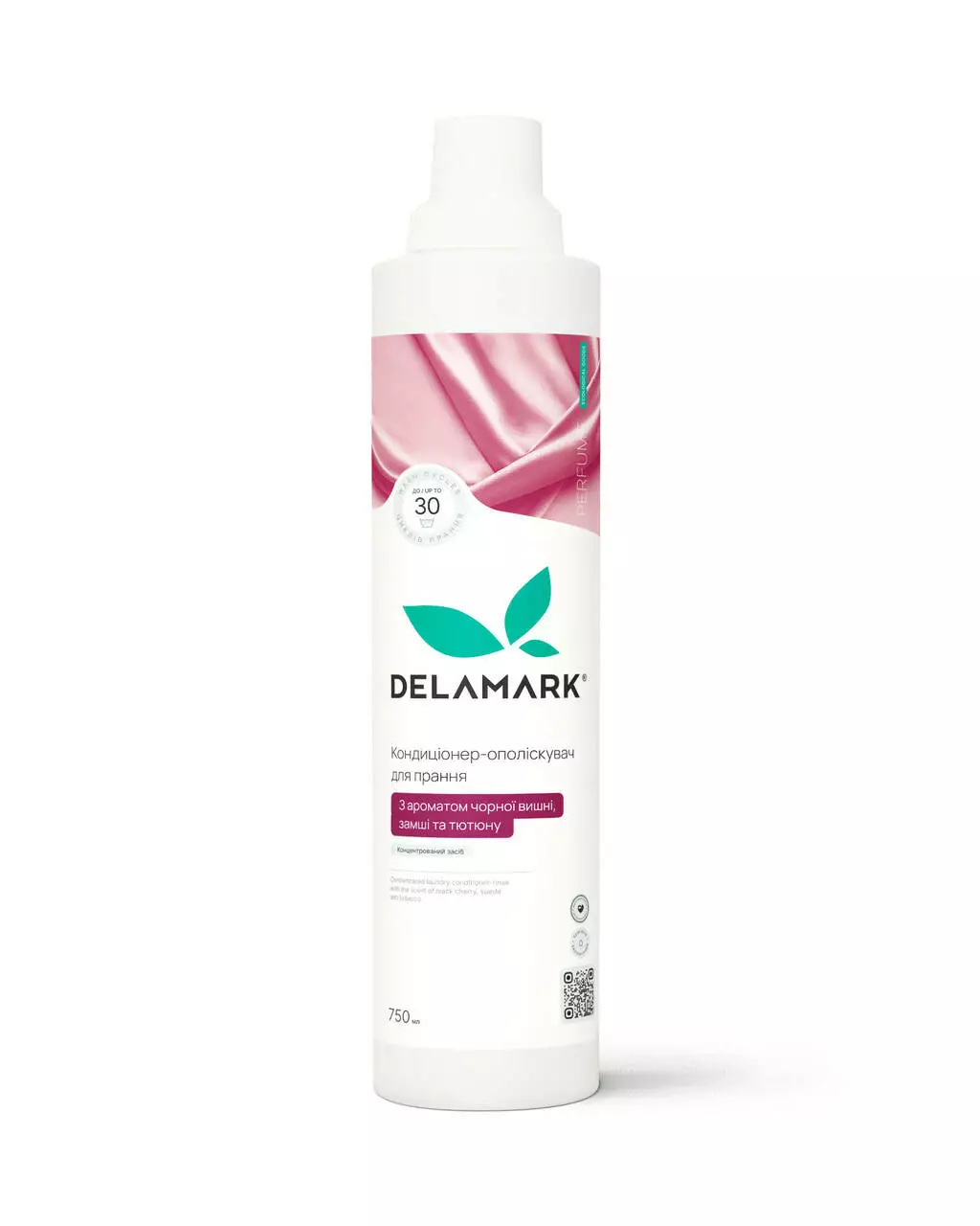 Концентрований безфосфатний кондиціонер-ополіскувач DeLaMark з ароматом чорної вишні, замші та тютюну розроблений технологами міжнародного рівня, щоб чисті речі надавали вашому життю ще більше комфорту. Компоненти в складі кондиціонера-ополіскувача: