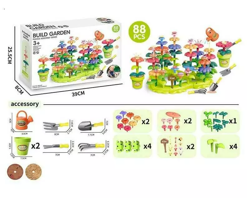 Конструктор A 42-2 (48/2) “Квітковий сад”, набір садівника,88 елементів, граблі, лопата, вила, лійка, вазон, квіти, в коробці