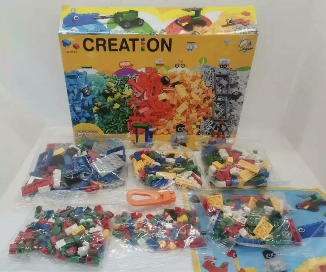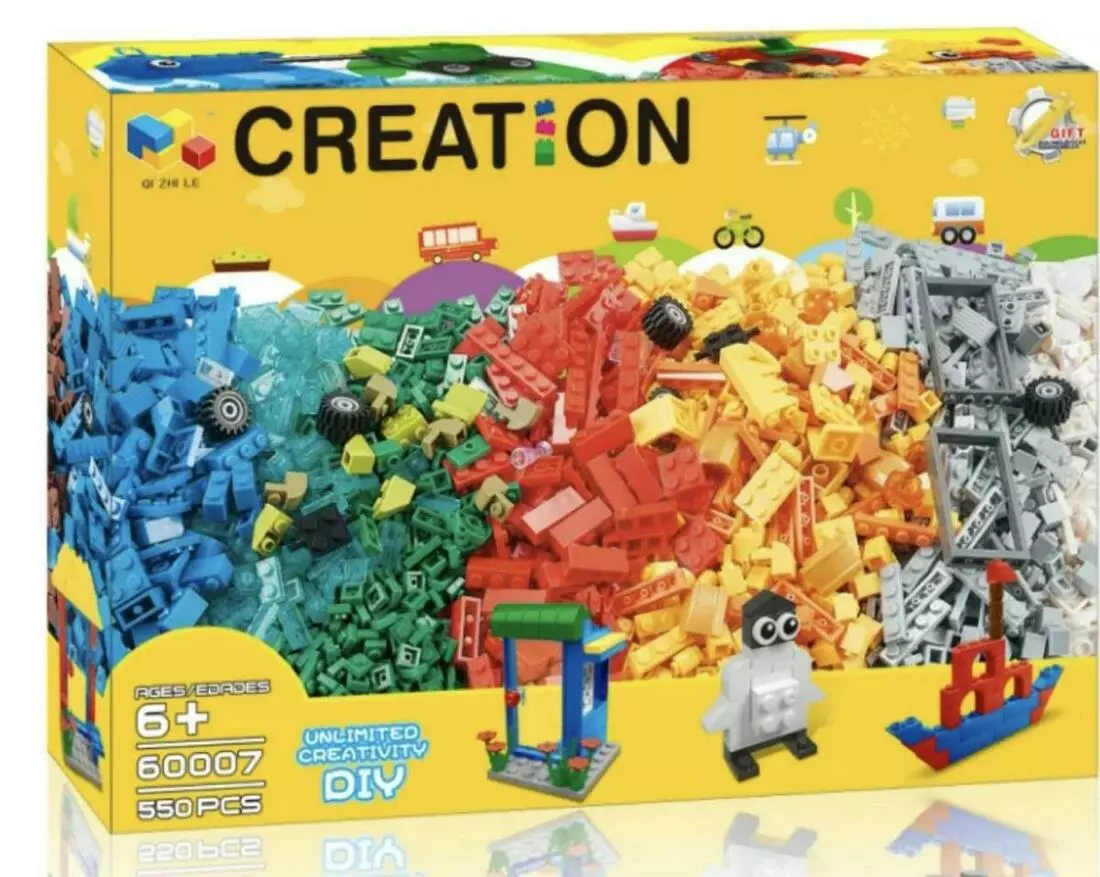 В наборе 550 разноцветных кубиков из которых малыш может сделать разнообразные конструкции.