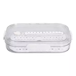 На дні контейнера розміщена дренажна підставка, яка створює простір для відведення зайвої вологи — це особливо зручно при зберіганні промитих овочів або ягід. На кришці присутня рельєфна шкала, що нагадує лінійку — її можна використовувати як вимірювальний індикатор висоти продуктів. Конструкція контейнера забезпечує ефективне зберігання в холодильнику, а його розміри дозволяють компактно розміщувати вміст.