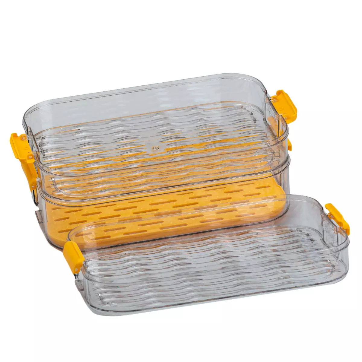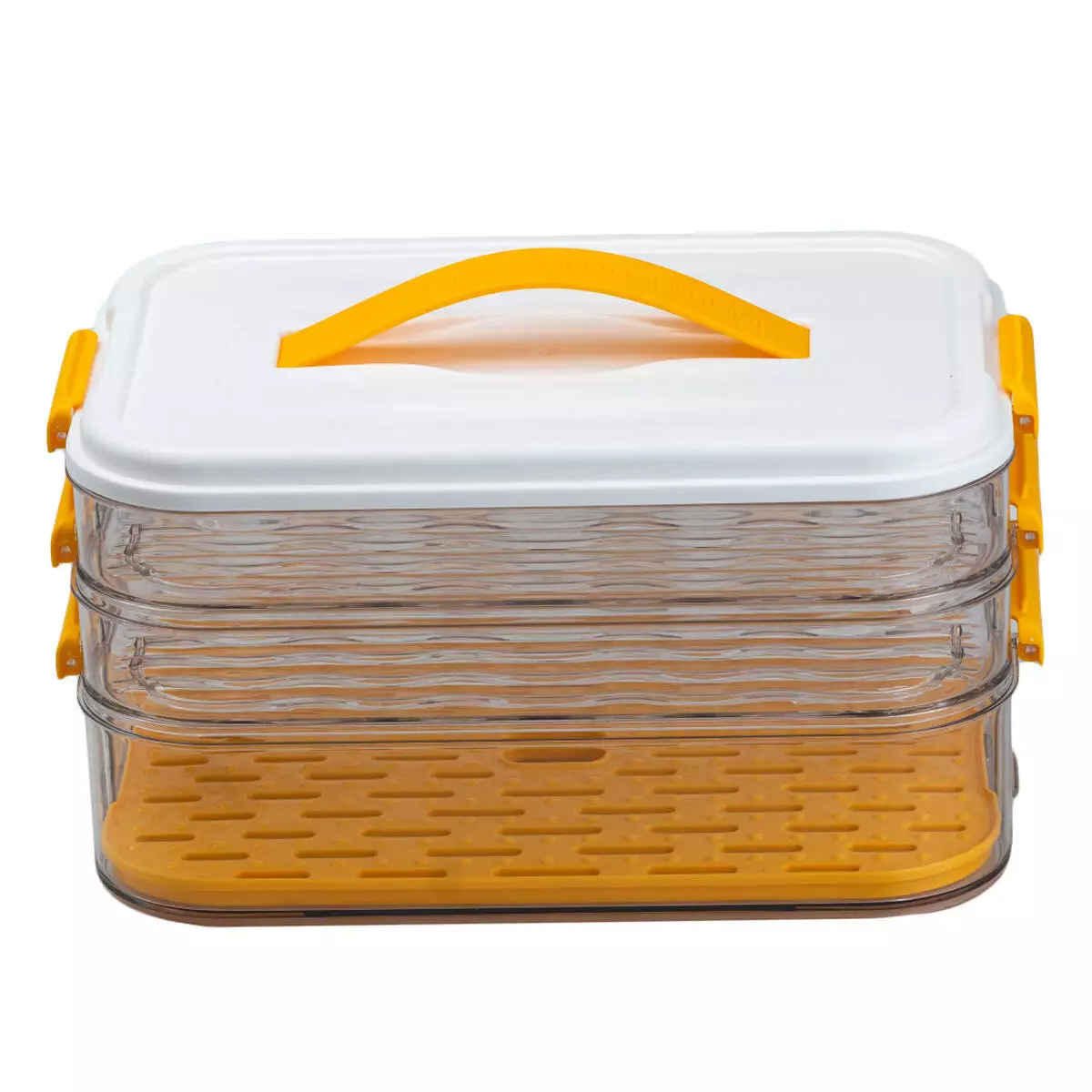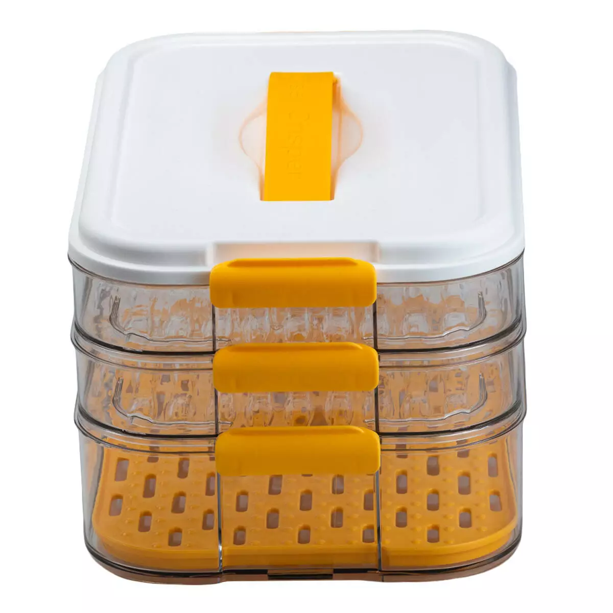 Триярусний контейнер для зберігання та заморожування продуктів виготовлений із прозорого пластику. Він розділений на три окремі секції з отворами, завдяки чому можна добре просушити фрукти та овочі перед заморожуванням, організувати зберігання різних продуктів окремо, і при цьому контейнер не займатиме багато місця у холодильнику чи морозильній камері.