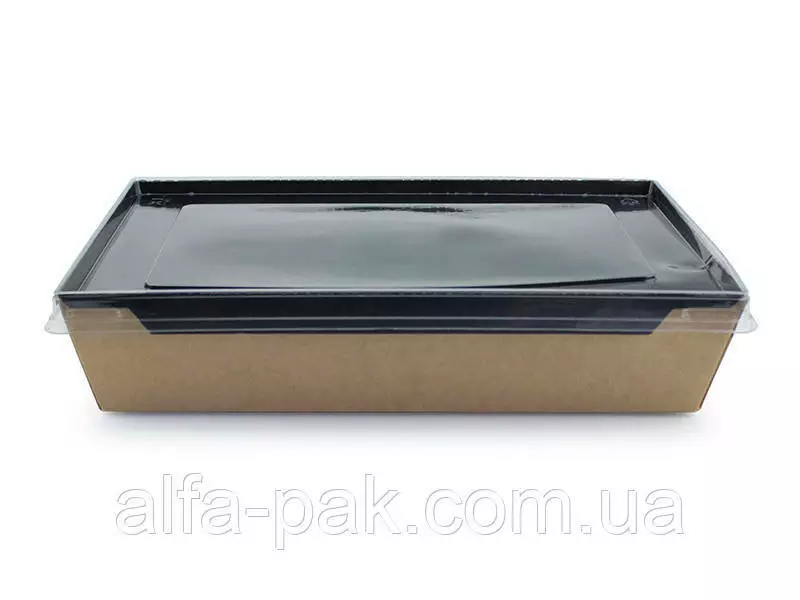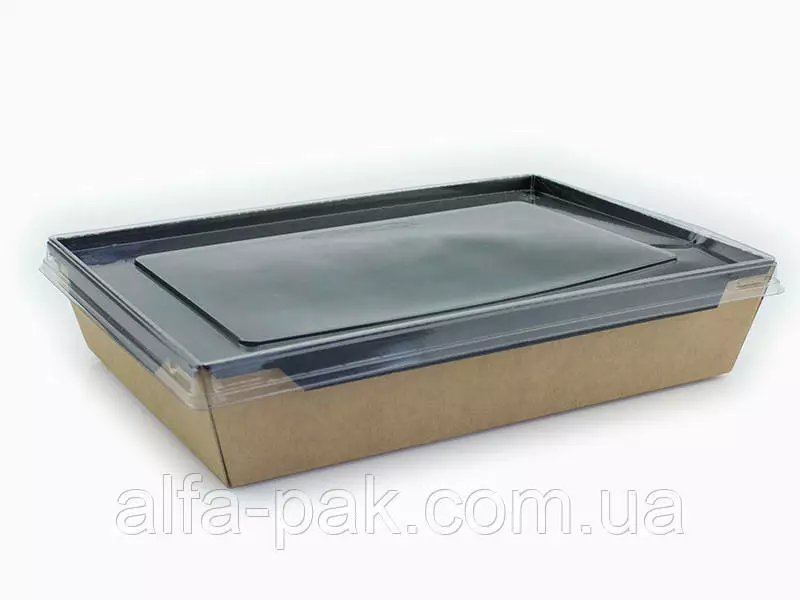 Контейнер прямоугольный крафт-черный с ПЭТ крышкой 2100 мл -