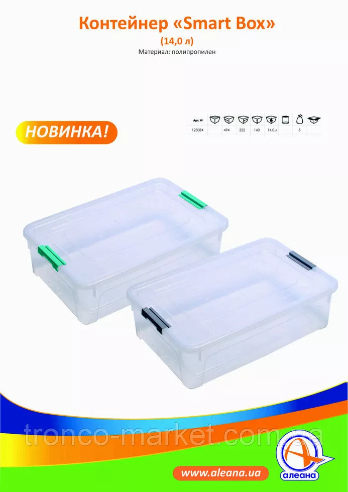 Новинка от украинского производителя АЛЕАНА - умные коробочки для хранения различных предметов на любой вкус. Разработан с целью помочь вам грамотно организовать хранение вещей в вашем доме. ?зготовлен из качественного полипропилена, удобный и вместительный. В нем можно хранить хранить ювелирные украшения, косметику и другие необходимые вещи. Оптимально подобранные объемы смартбоксов удивят вас своим разнообразием : 0,175 л ; 0,375 л; 0,4 л; 0,8л; 1,7 л; 3,5л ; 3,8л ; 7,9 л; 14л ;27л; 40 л . Линейка смартбоксов предлагает три вида контейнеров : простые прозрачные смартбоксы, прозрачные смартбоксы с органайзером, цветные смартбоксы спринг. Все они имеют ровную правильную форму, которая максимально позволит съэкономить пространство, имеют крепкие зажимы для надежного хранения.Правильно организованное хранение,при этом еще и радущее глаз гарантирует порядок в доме и в мыслях. Проверьте на себе! :)