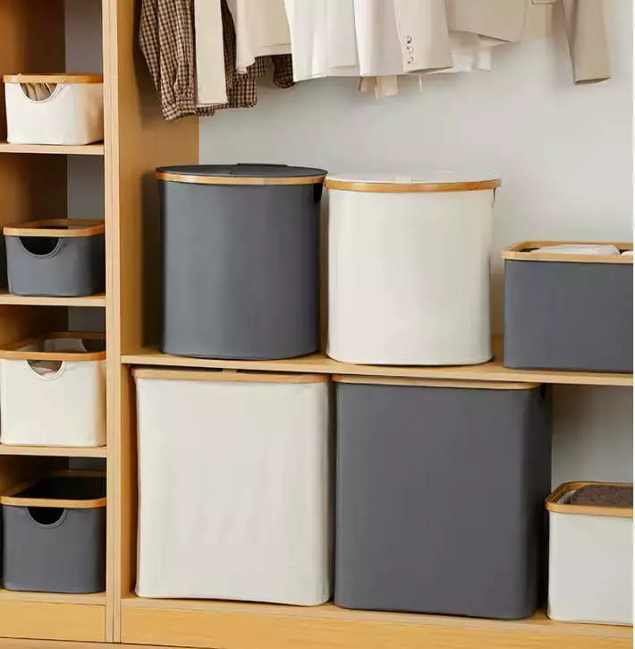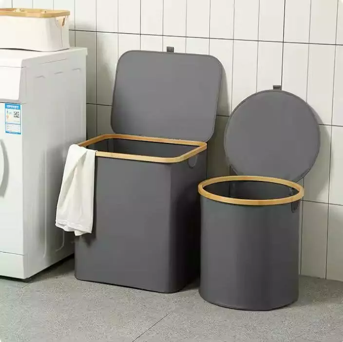 Корзина складная для белья с крышкой и бамбуковыми ручками в сером