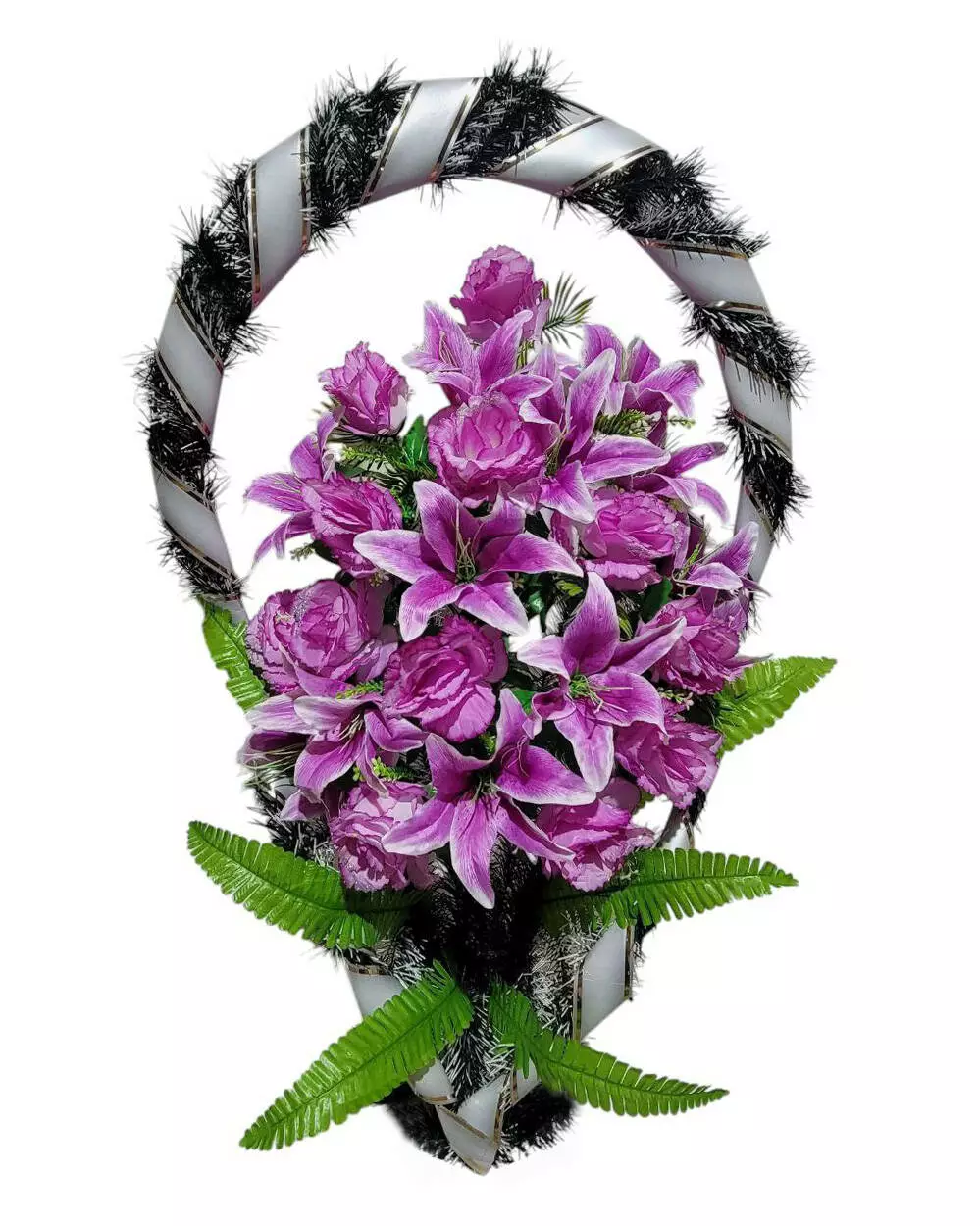 прикрашений букетом лілії та троянди, листям папороття та