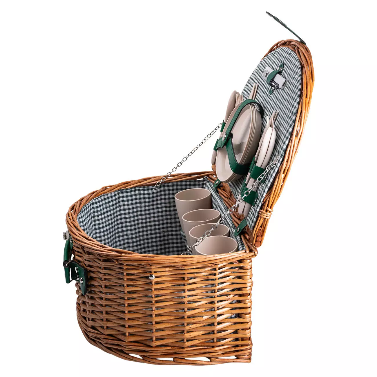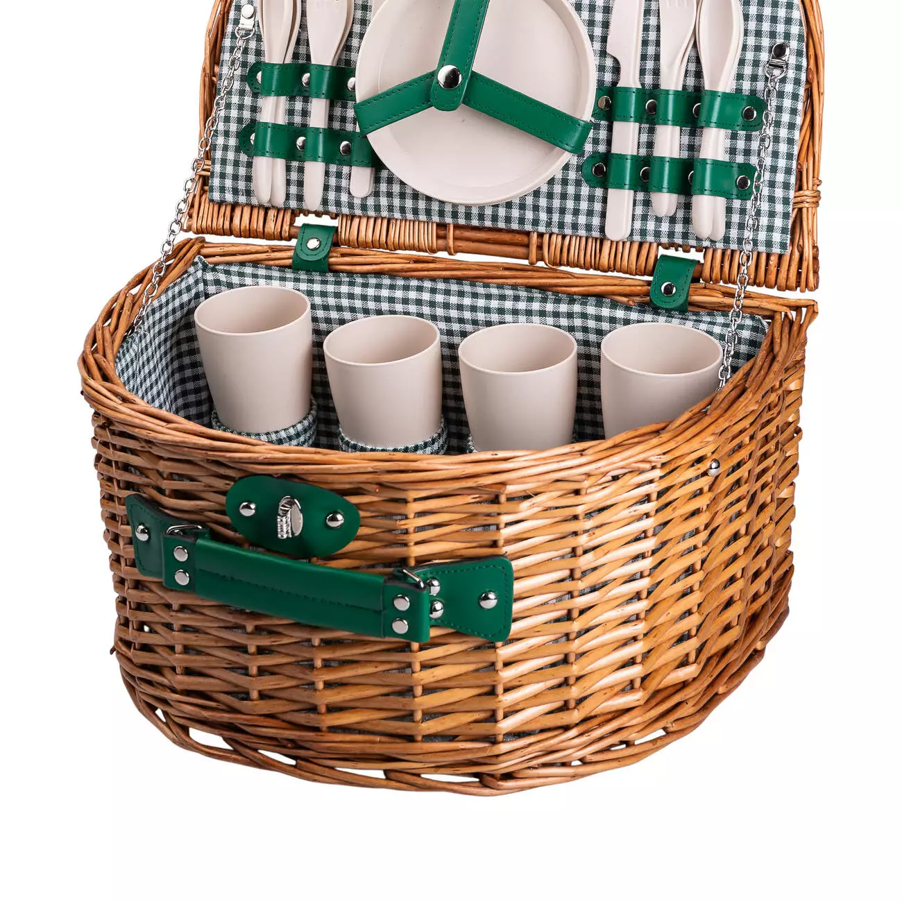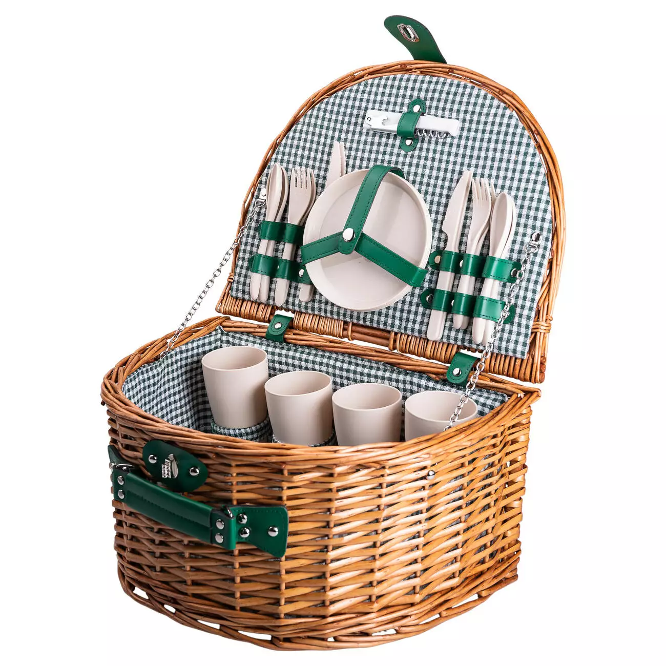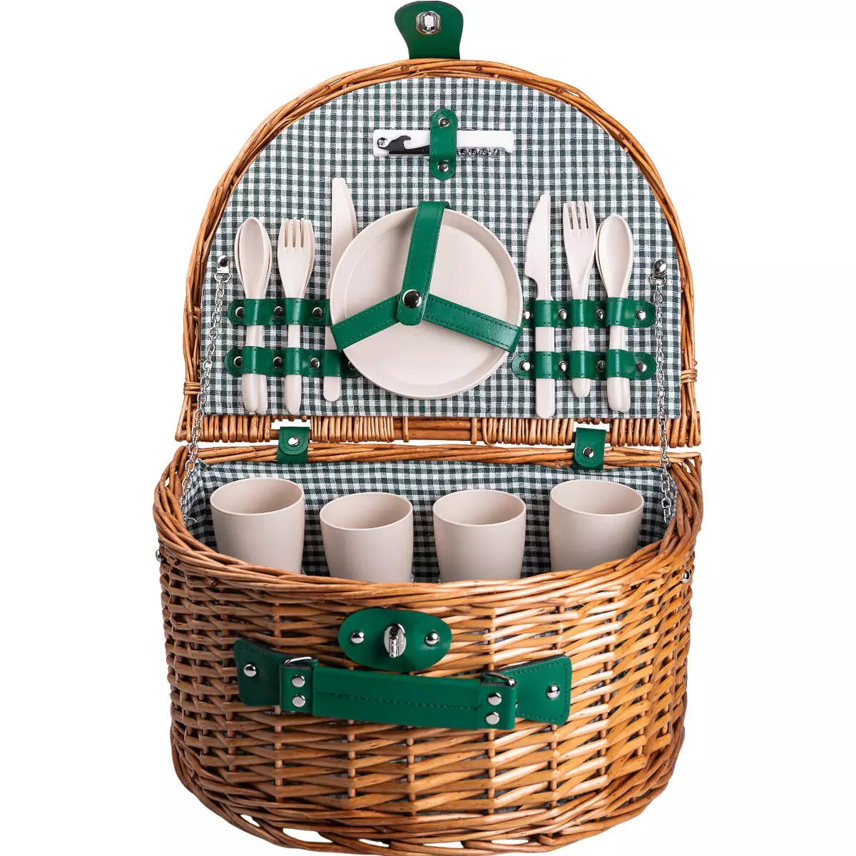 Кошик для пікніка з набором столових приборів на 4 особи - відмінне рішення для відпочинку на природі. Кошик виготовлений з екологічних матеріалів та повністю укомплектований необхідним для пікніка посудом, який фіксується ременями з екошкіри: