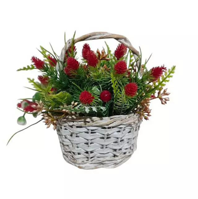 Кошик плетений "Малюк" прикрашений гілочками аспарагуса, папороттю, букетиками з шишками та калиною, розміром 15*13см.