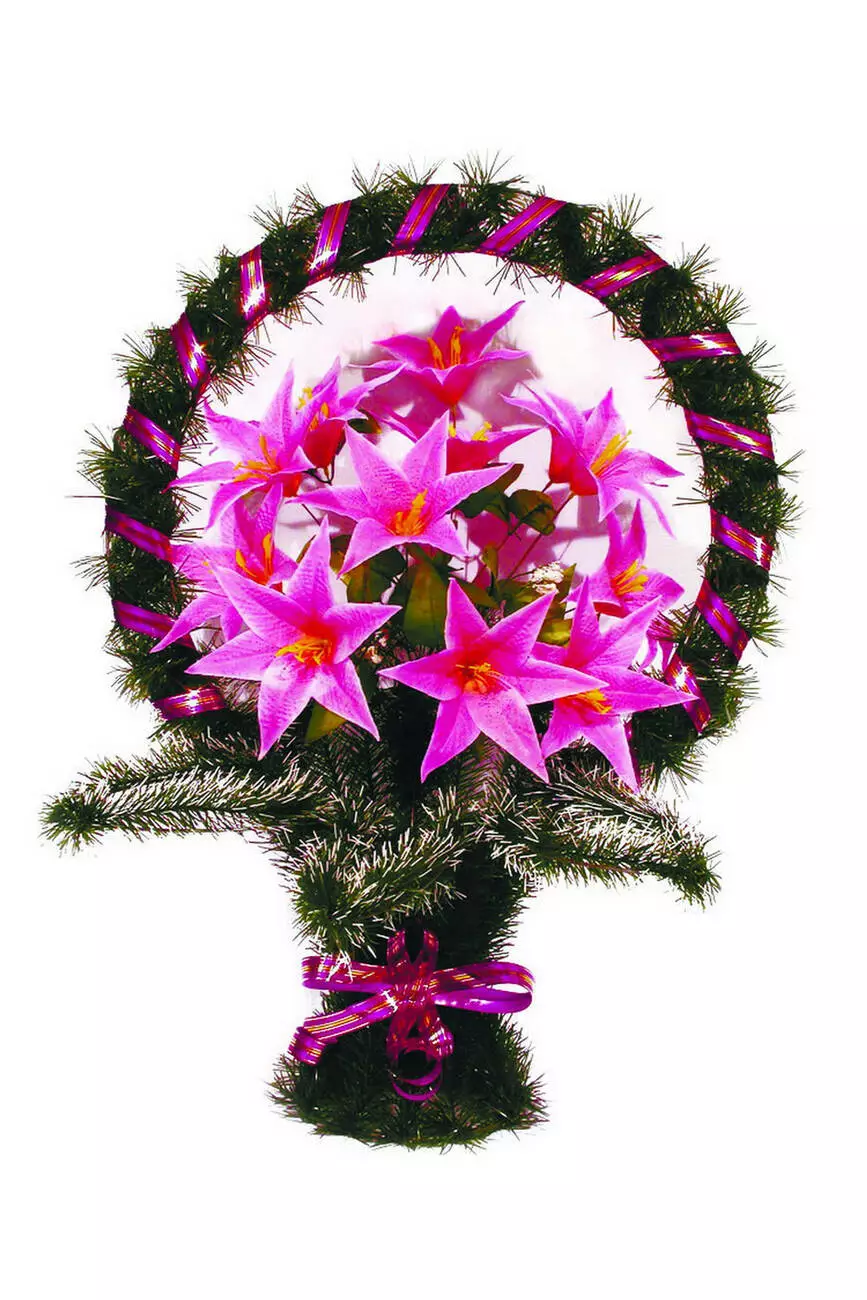 прикрашений букетом лілії та ритуальною стрічкою. Кольорову гаму на