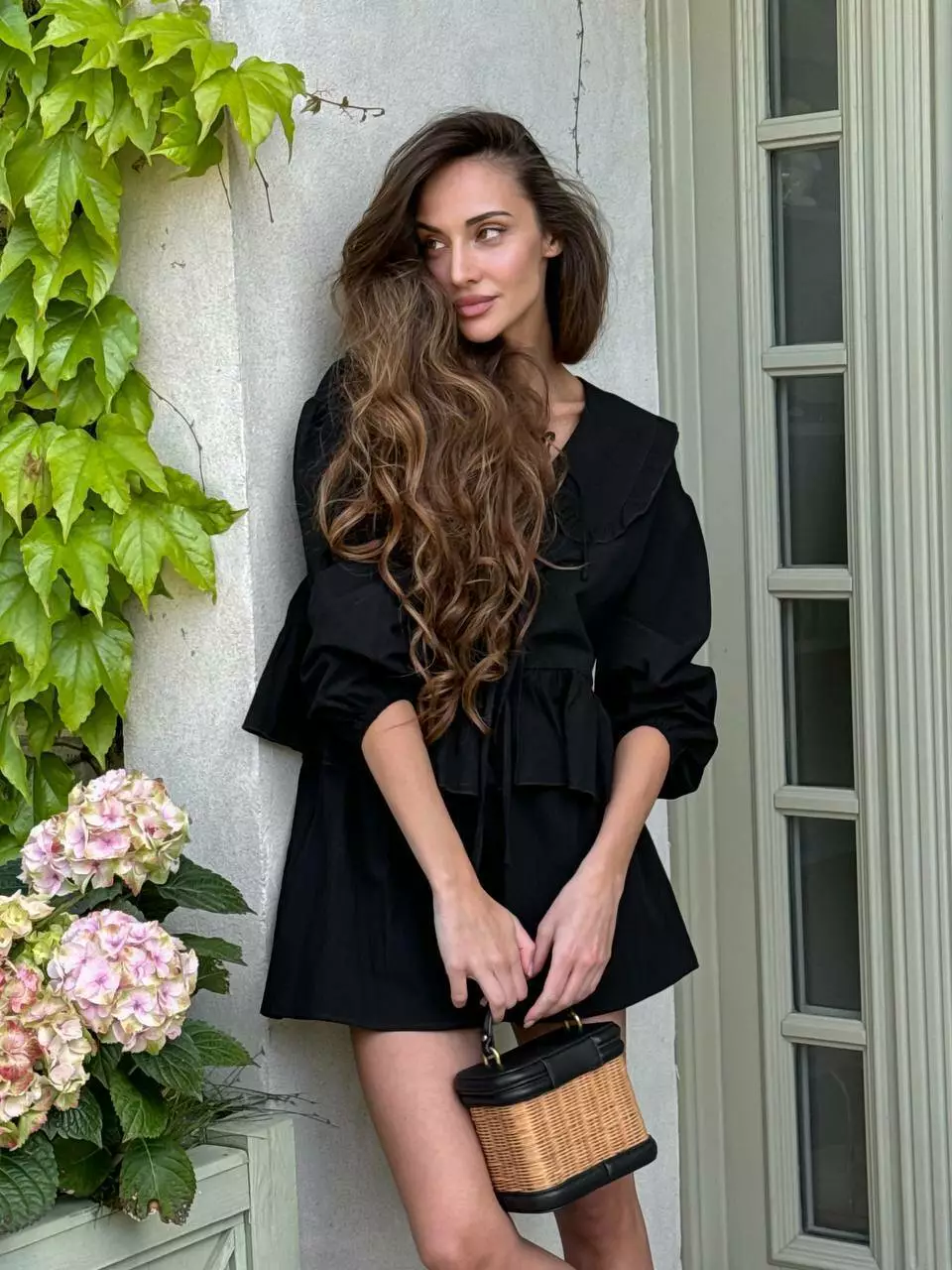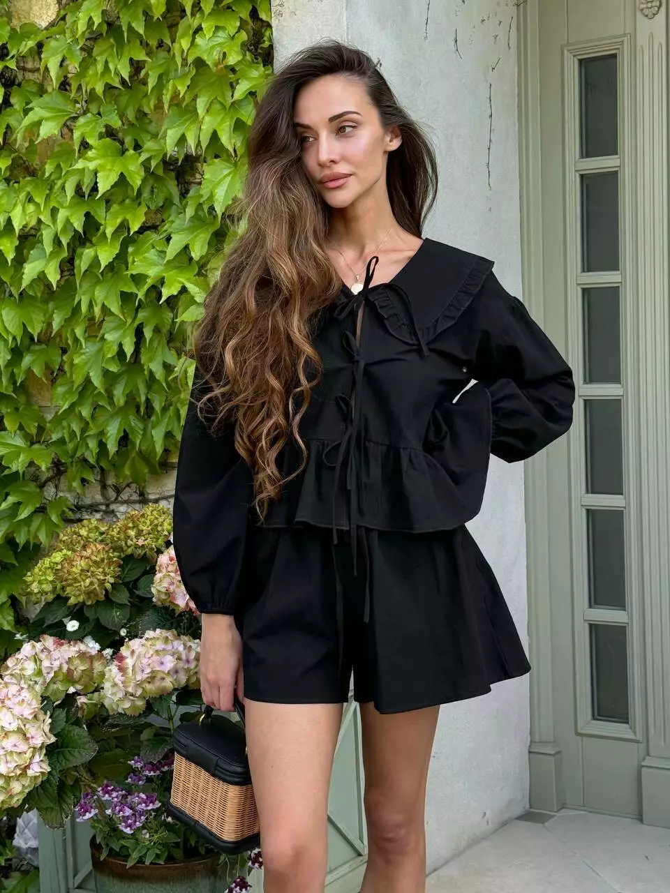 Витончений костюм, в трендовому поєднанні сорочки з коміром та шорт, що схожі на спідницю.