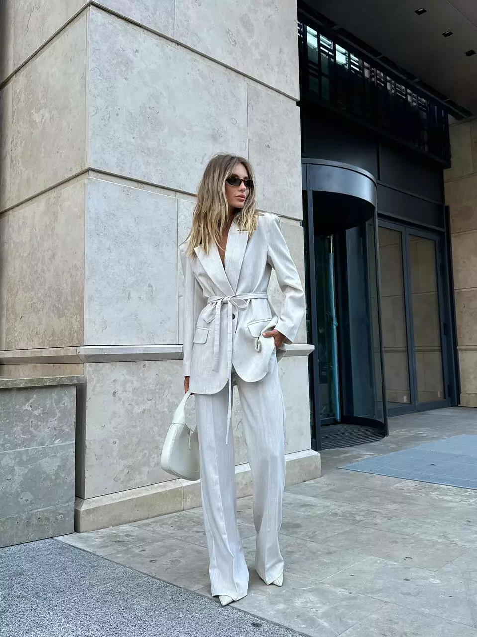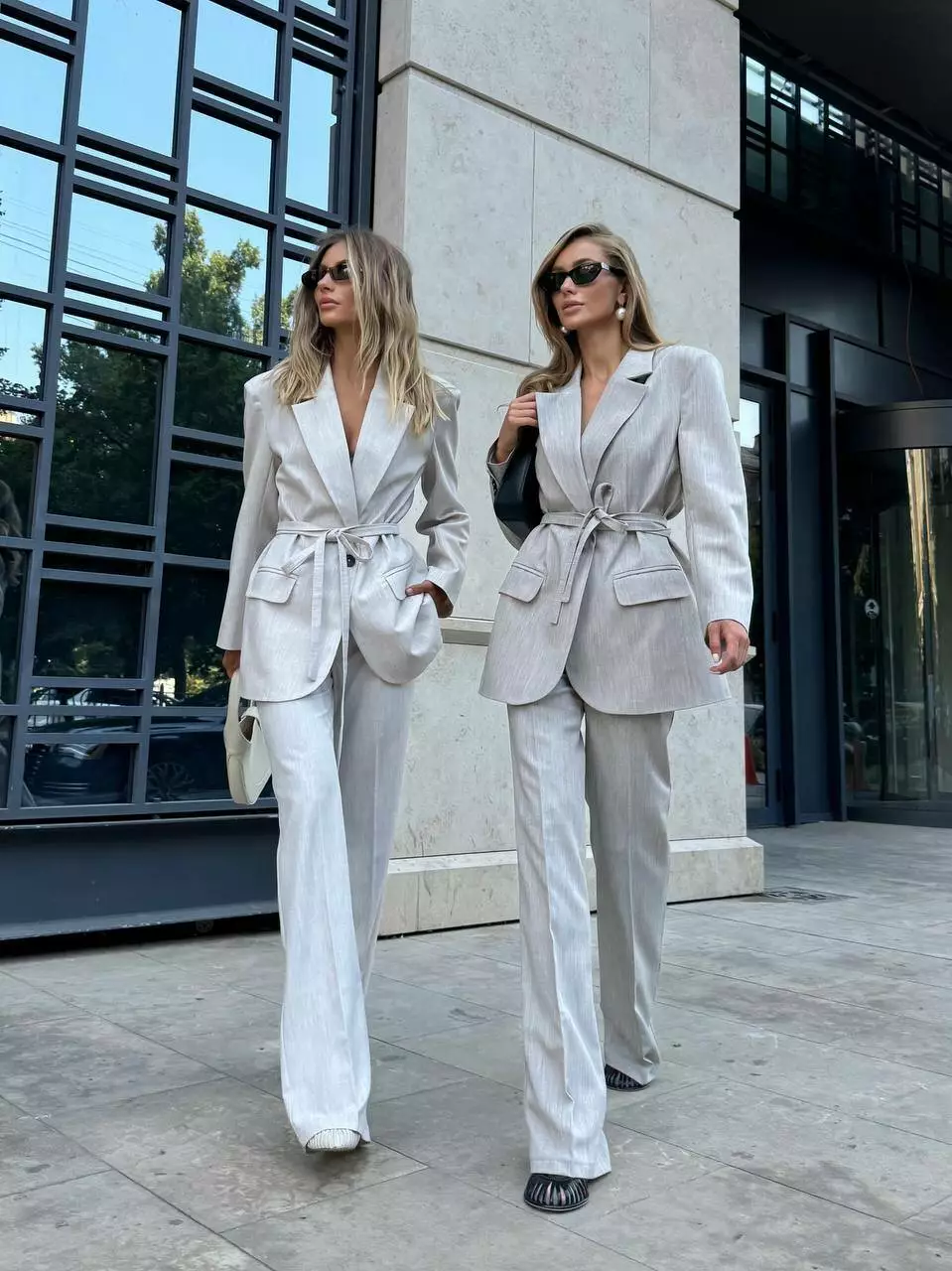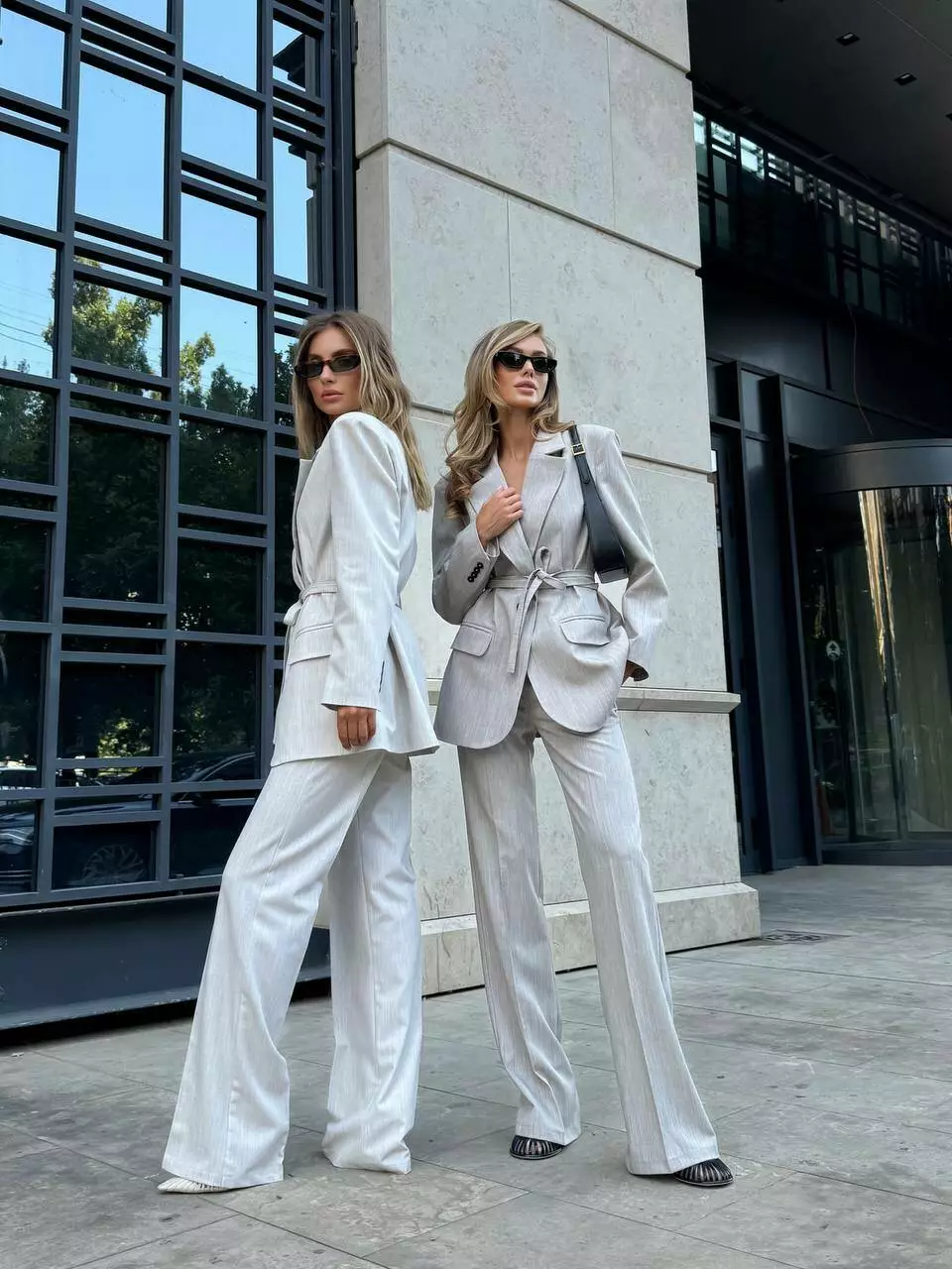 Стильний класичний костюм, під пояс Піджак з чоловічого плеча, прямого крою Брюки прямого крою, на трохи заниженій посадці. Пояс шнурок в комплекті. Тканина : преміальна костюмка