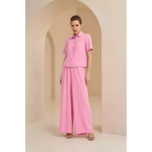 Цей костюм у рожевому кольорі — справжня знахідка для модниць, які шукають стильний і зручний одяг. Складається з блузи з коротким рукавом і штанів з віскозної тканини з жаткою, що надає їм текстури та об'єму. Блуза має короткий рукав, що робить її ідеальною для літнього сезону. Її ніжний рожевий колір підкреслює жіночність і створює романтичну атмосферу. Крім того, блуза має застібку на ґудзики, що забезпечує комфортну посадку на фігурі. Штани забезпечують максимальний комфорт і свободу руху, завдяки прямому крою. Носіть цей комплект як разом, так і окремо — у будь-якому разі матимете розкішний вигляд.