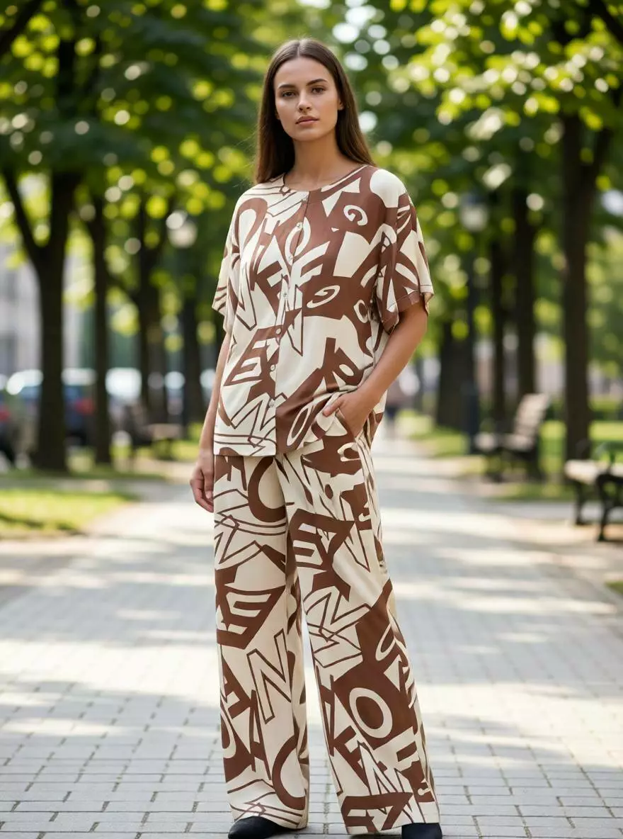 Для прихильниць теплих та благородних відтінків. Поєднання молочного фону з кавовим принтом виглядає неймовірно ніжно та дорого. Цей костюм ідеально підкреслює літню засмагу та створює розслаблений, але доглянутий образ. Чудово підійде як для міських прогулянок, так і для відпустки біля моря.