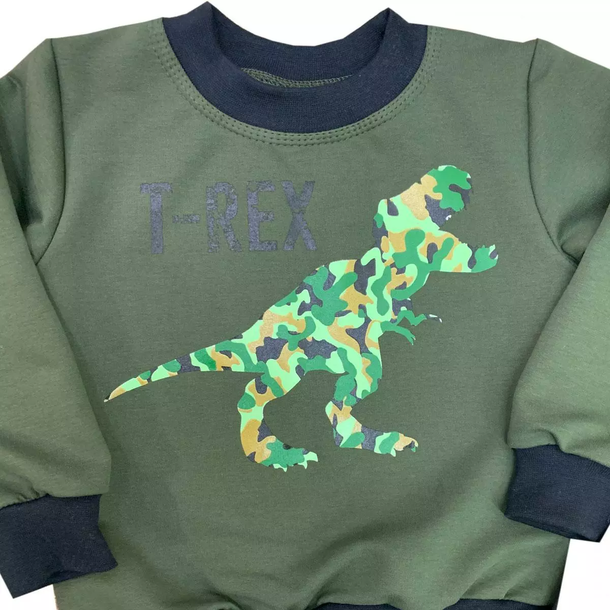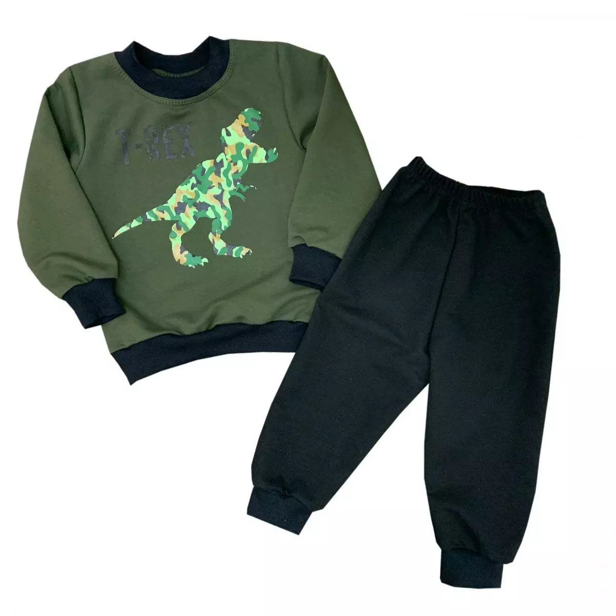 Стильный повседневный костюм для мальчиков Динозавр T-REX. Кофта декорирована рисунком Динозавра. Штаны на резинке без карманов. Рукава и штанины на манжетах. Полотно - двухнитка: натуральное, плотное, воздухопроницаемое, износостойкое, гипоаллергенное.