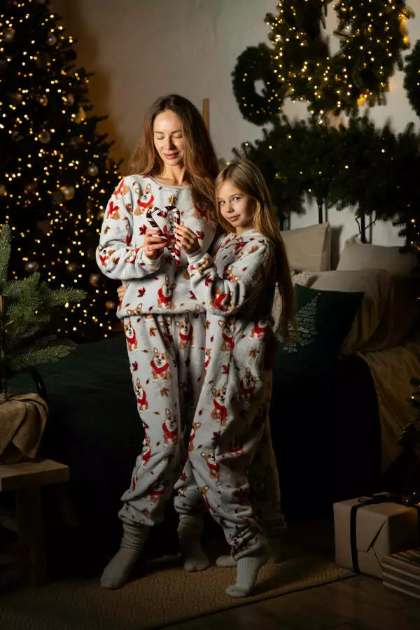 Піжамний костюм із м’якого велсофту з милим принтом коргі створений для максимального комфорту та затишку. Комплект складається зі світшота вільного крою та штанів на резинці з манжетами. Манжети на рукавах і штанах, а також комір світшота виконані у червоному кольорі, що додає яскравих акцентів до образу. Теплий і приємний до тіла матеріал добре зберігає форму, не викликає подразнення та легко переться. Сірий колір із веселим малюнком собачок у шарфиках і осіннього листя створює затишну атмосферу для відпочинку вдома чи прохолодних вечорів