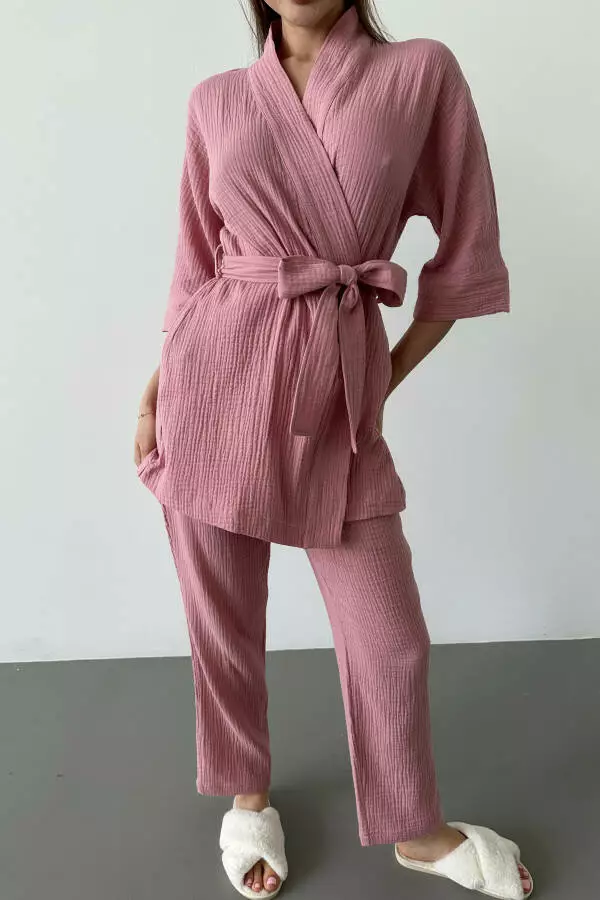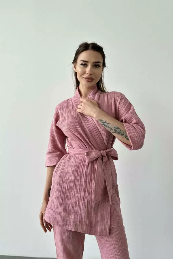 короткий кімоно-халат з поясом і прямі штани. Виготовлений з
