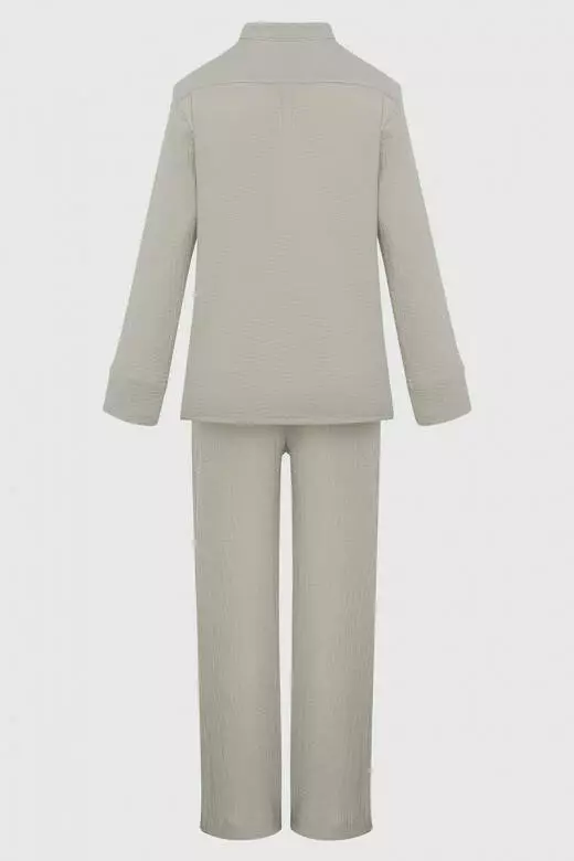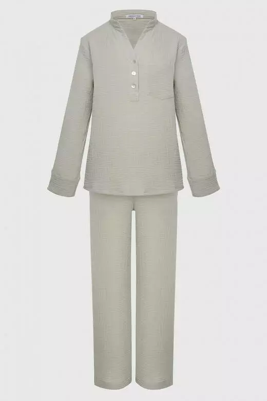 Якщо ви в пошуках ідеального домашнього одягу, то цей сірий костюм найкращий варіант. Дуже комфортна модель, виконана з якісної тканини мусліну, склад тканини 100% бавовна, яка приємно прилягає до тіла і дарує відчуй домашнього затишку. Натуральне бавовняне полотно не подразнює шкіру, не викликає алергію, добре вбирає вологу та пропускає повітря. Цей костюм є універсальним і доступний у всіх розмірах (s,m,l,xl). Сорочка з невеличким комірцем та V-образним вирізом, глибина якого регулюється за допомогою світлих ґудзиків, довгі широкі рукава з манжетом, також для вашої зручності з ліва є невеличка кишеня, для дрібних речей. Штани вільного крою на резинці, з двома кишенями по боках, та широкі з низу, в яких в почуваєтесь вільно і зручно. Сам костюм не сковує рухи, тому є дуже зручним в носінні, а бузковий колір підкреслить вашу жіночність і ніжність. Той самий комфортабельний варіант, який підійде кожному.