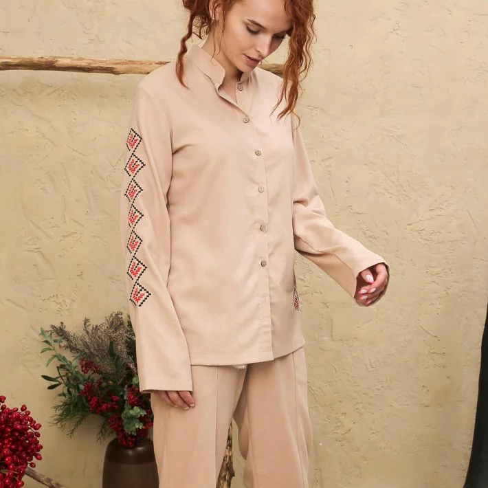 на гудзиках, на горловині стійка. Костю зроблено з класичним