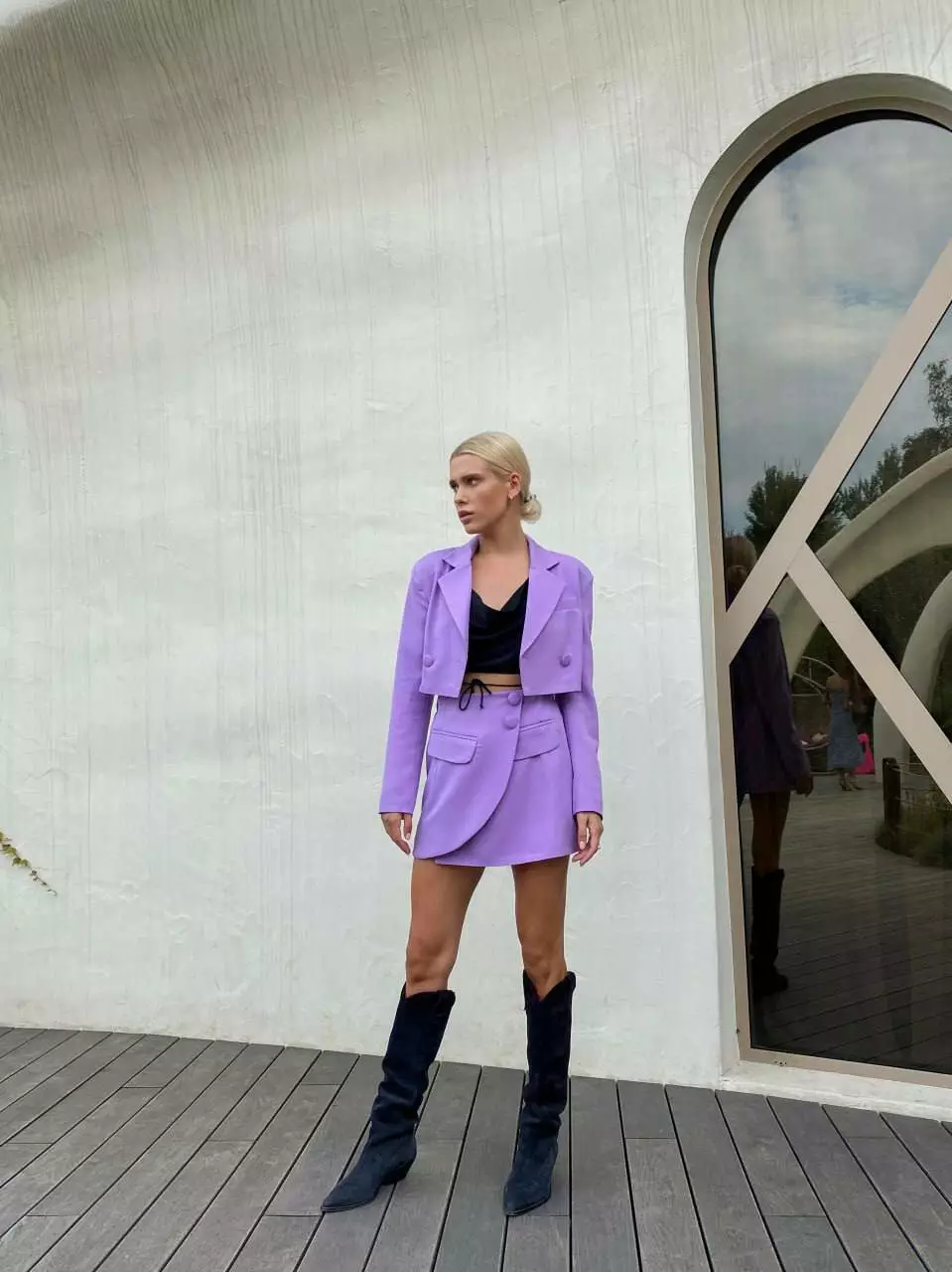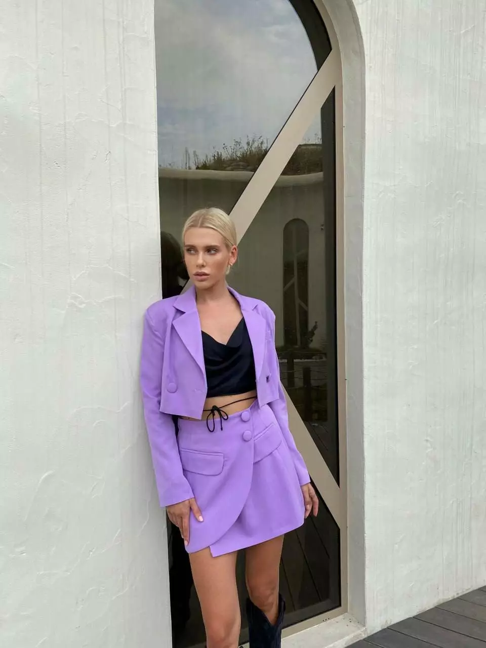 У люксовому виконанні Кроп-жакет двобортний та спідниця з імітацією запах з невеликим розрізом