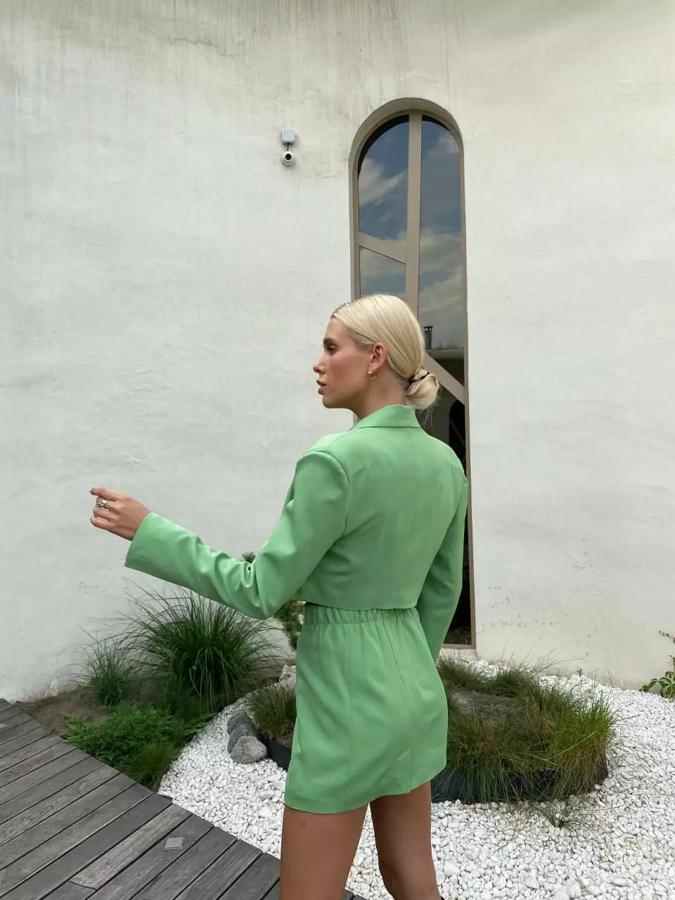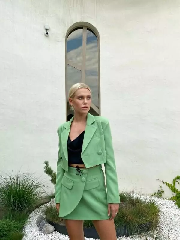 У люксовому виконанні Кроп-жакет двобортний та спідниця з імітацією запах з невеликим розрізом