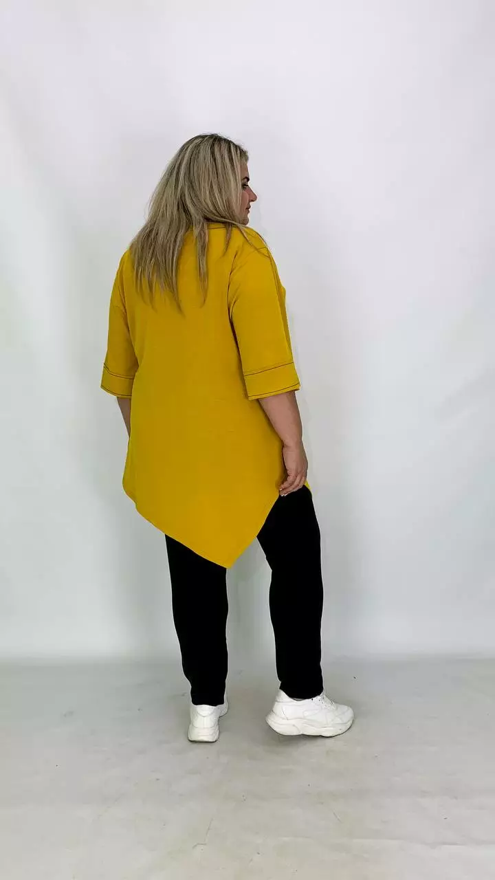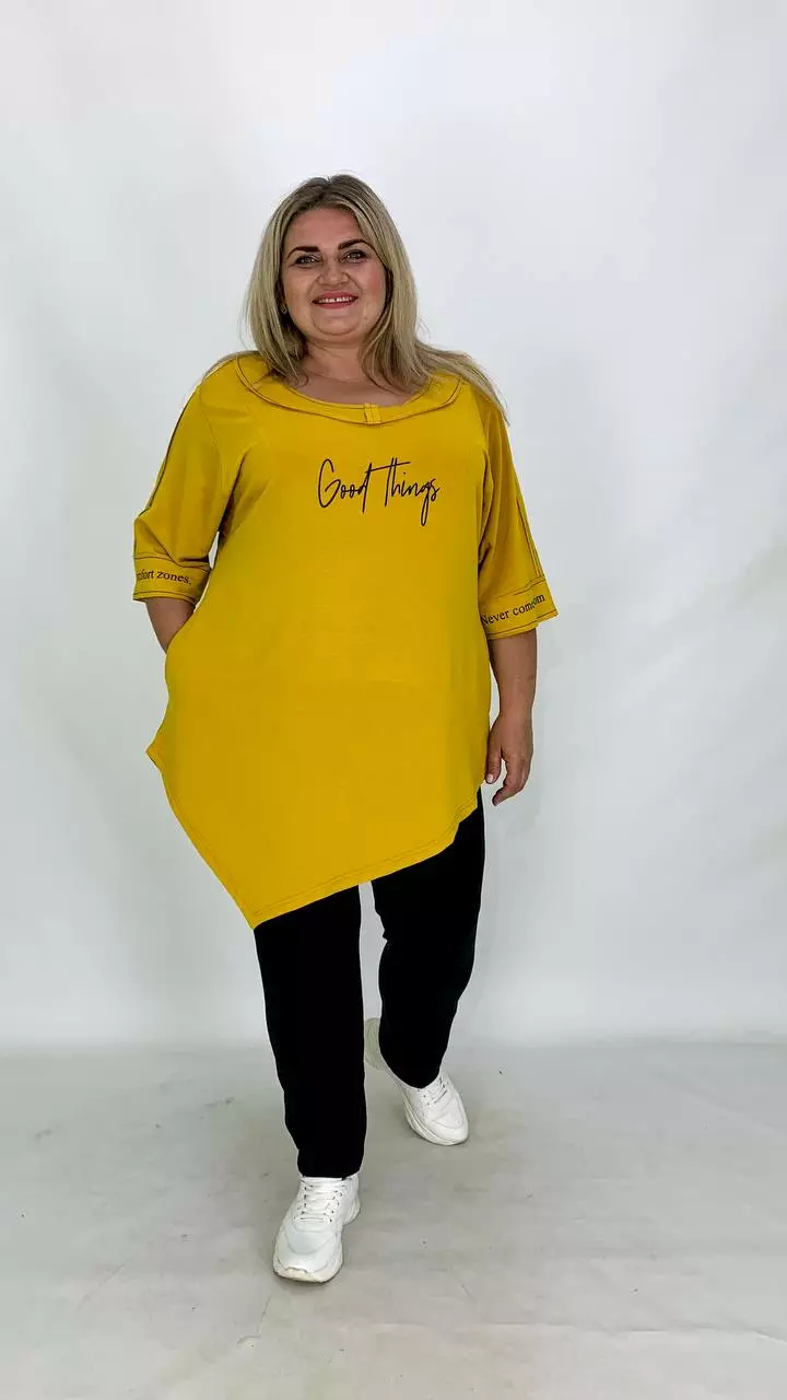Тканина: двонитка - 47% бавовна, 3% еластан, 50% поліестер. Костюм складається з асиметричної туніки - рукав до ліктя, горловина кругла. Штани на резинці. Виріб виконаний модною технікою - "шви назовні".