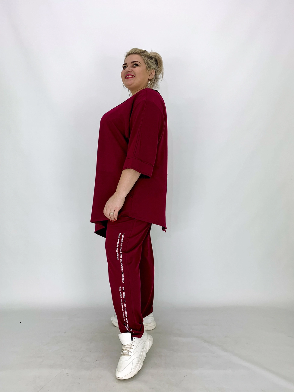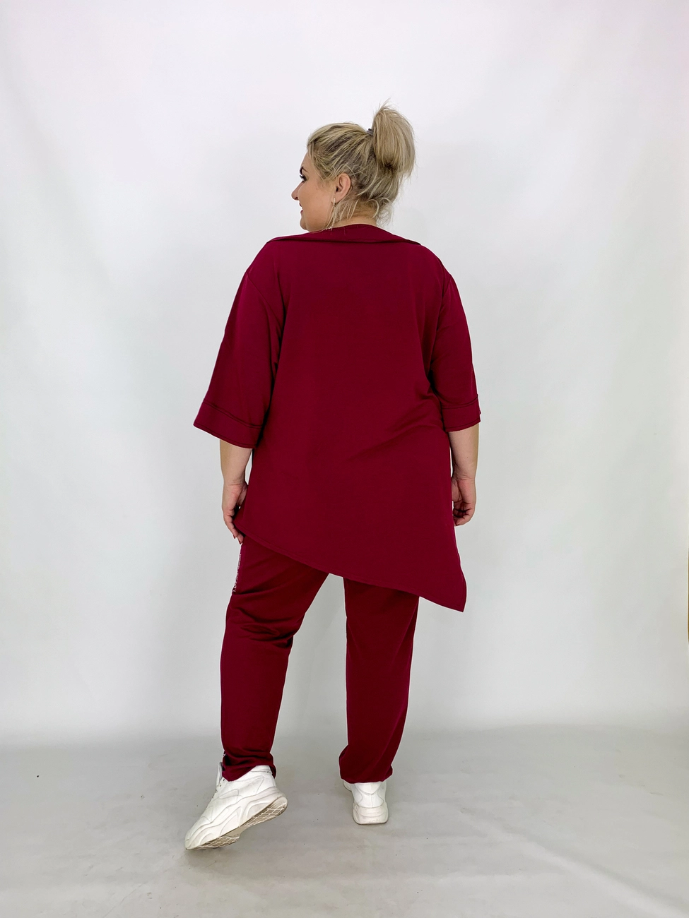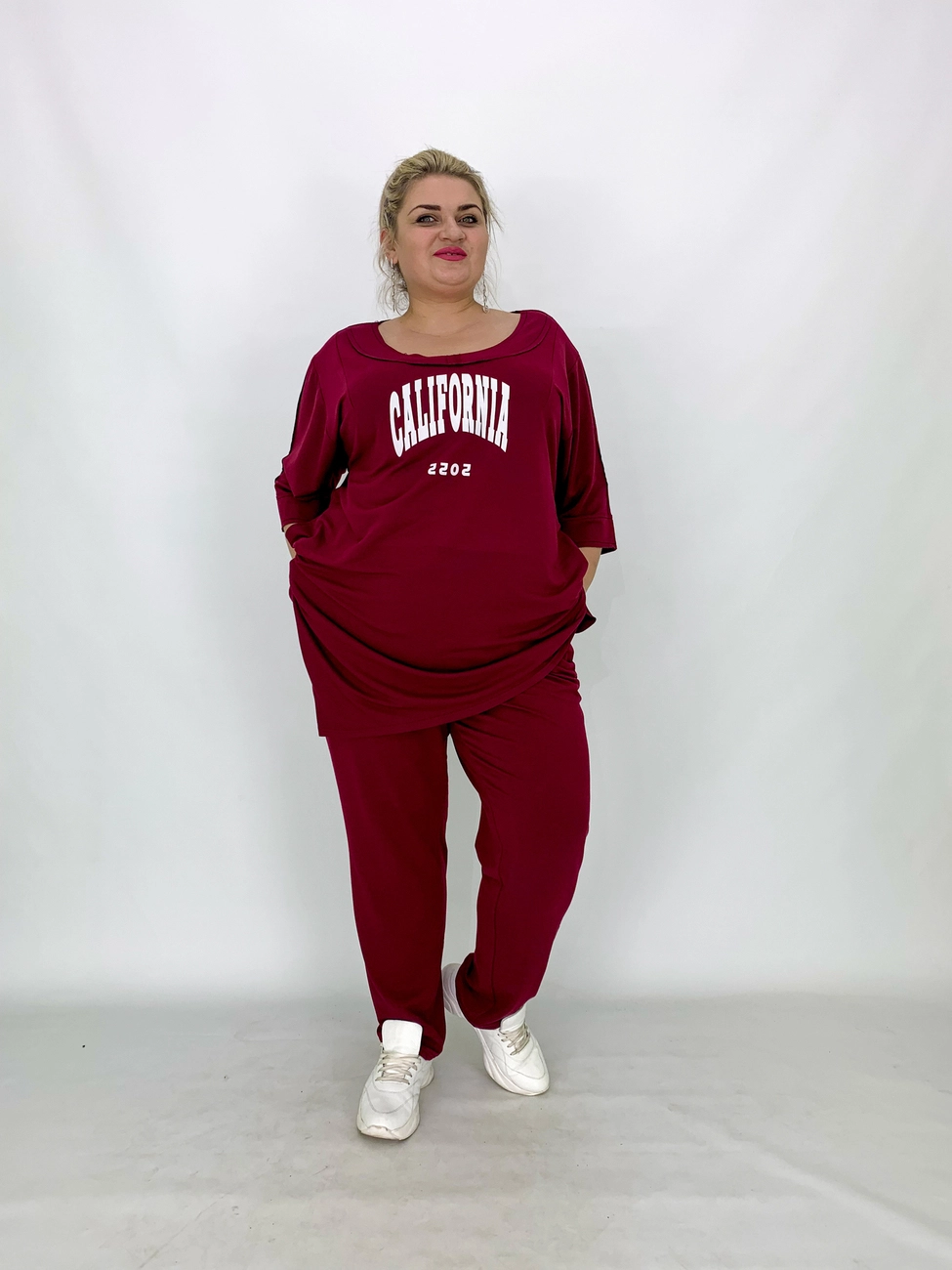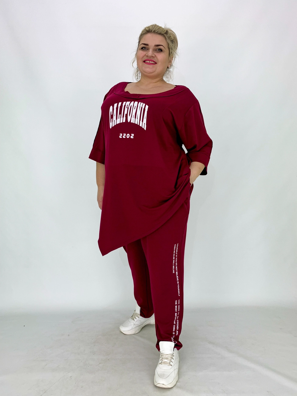 Тканина: двонитка - 47% бавовна, 3% еластан, 50% поліестер. Костюм складається з асиметричної туніки - рукав до ліктя, горловина кругла. Штани на резинці. Виріб виконаний модною технікою - "шви назовні".