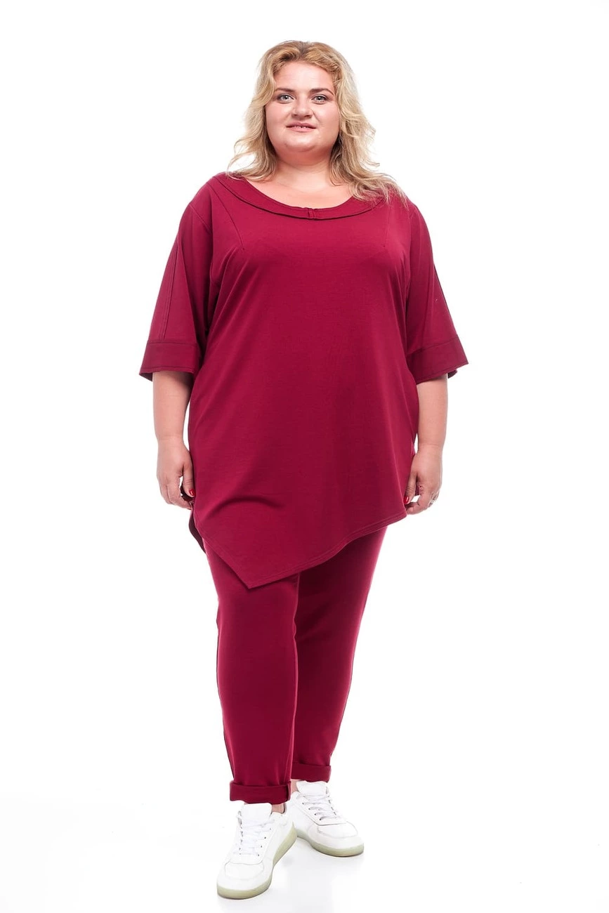 Тканина: двонитка - 47% бавовна, 3% еластан, 50% поліестер. Костюм складається з асиметричної туніки - рукав до ліктя, горловина кругла. Штани на резинці. Виріб виконаний модною технікою - "шви назовні". Розміри