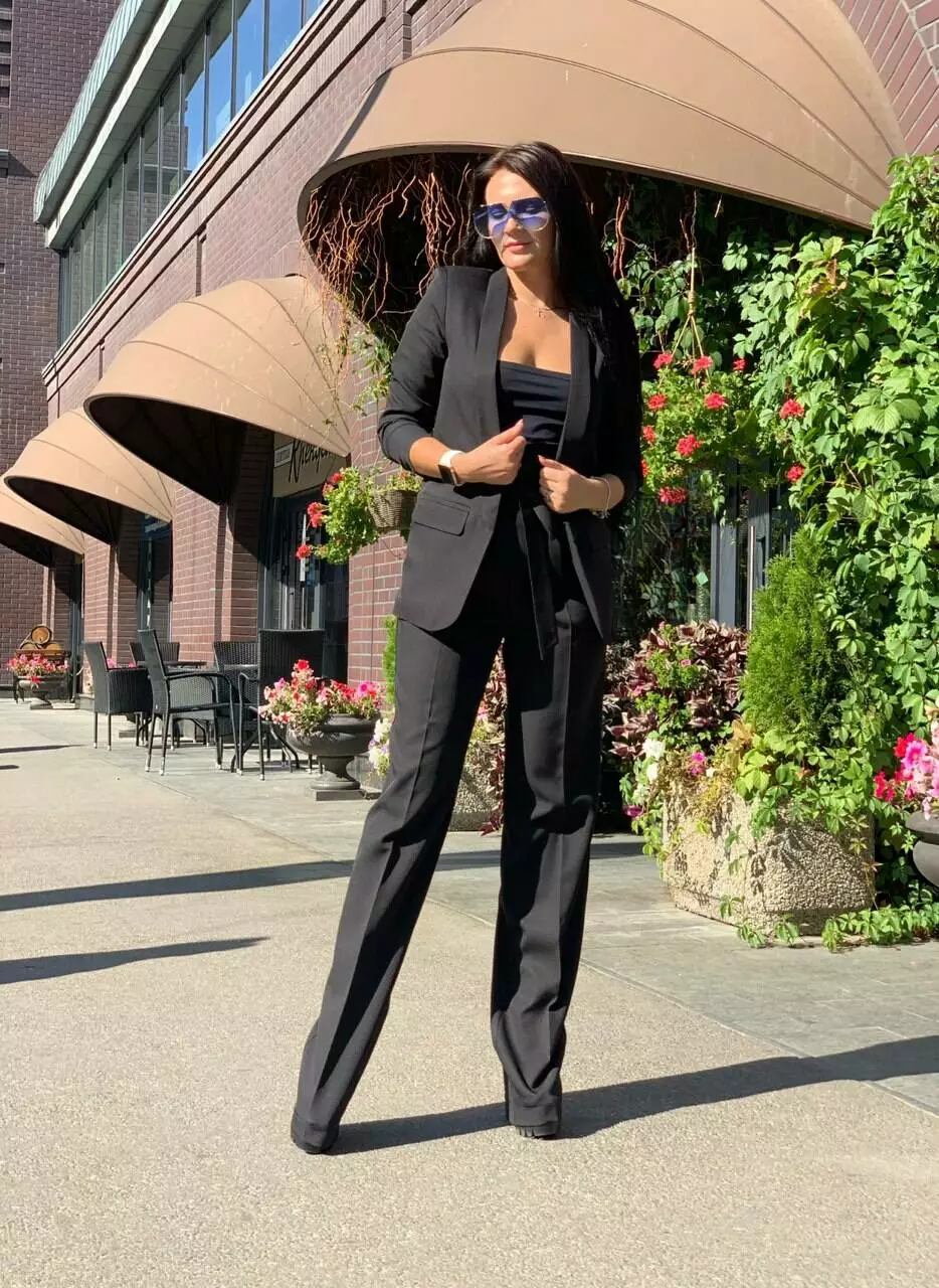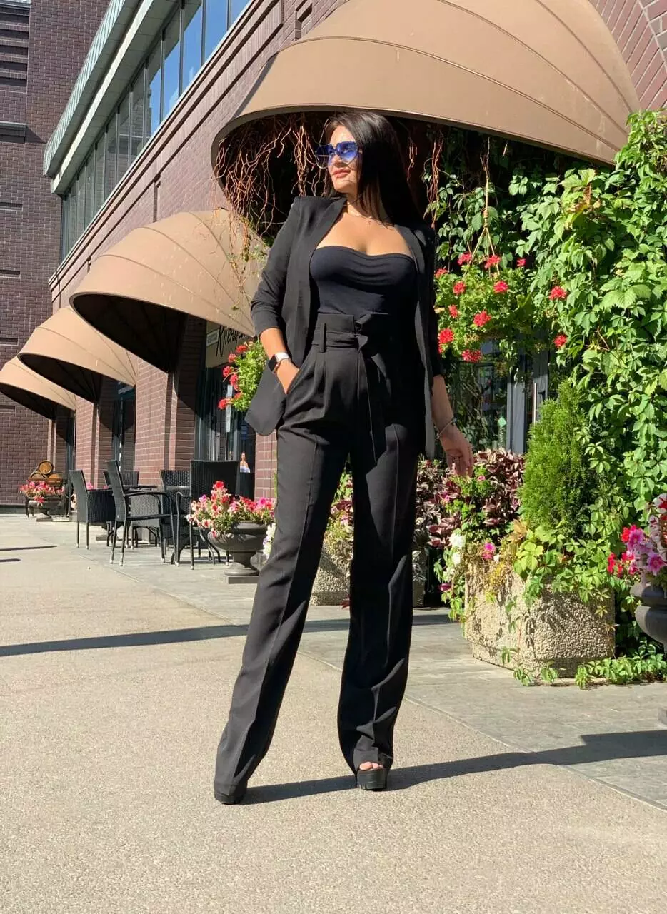 Стильний класичний костюм з тендовими штанами-трубами високої посадки та дуже ефектним піджаком з рукавами 3/4