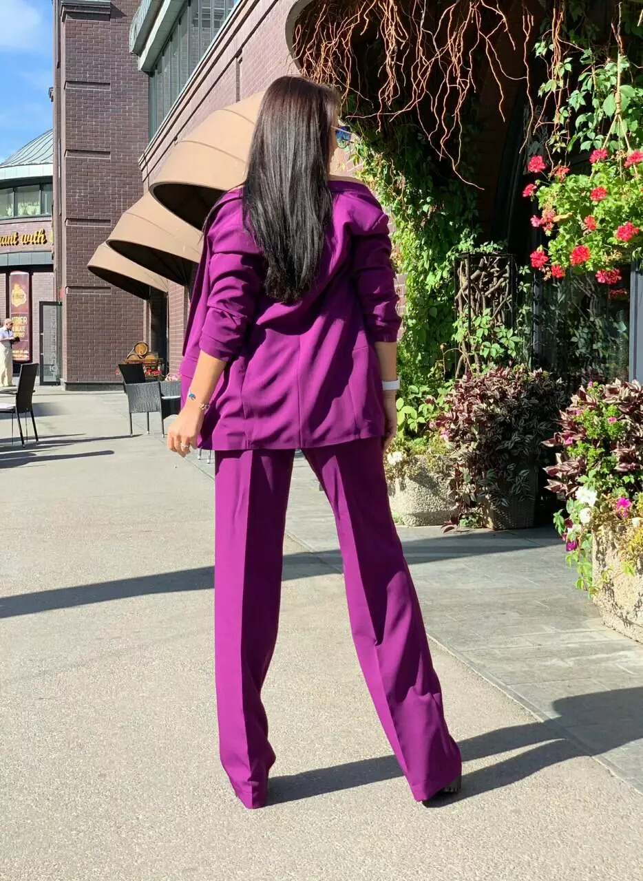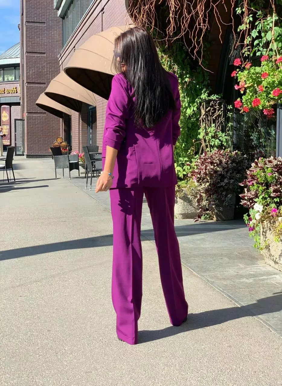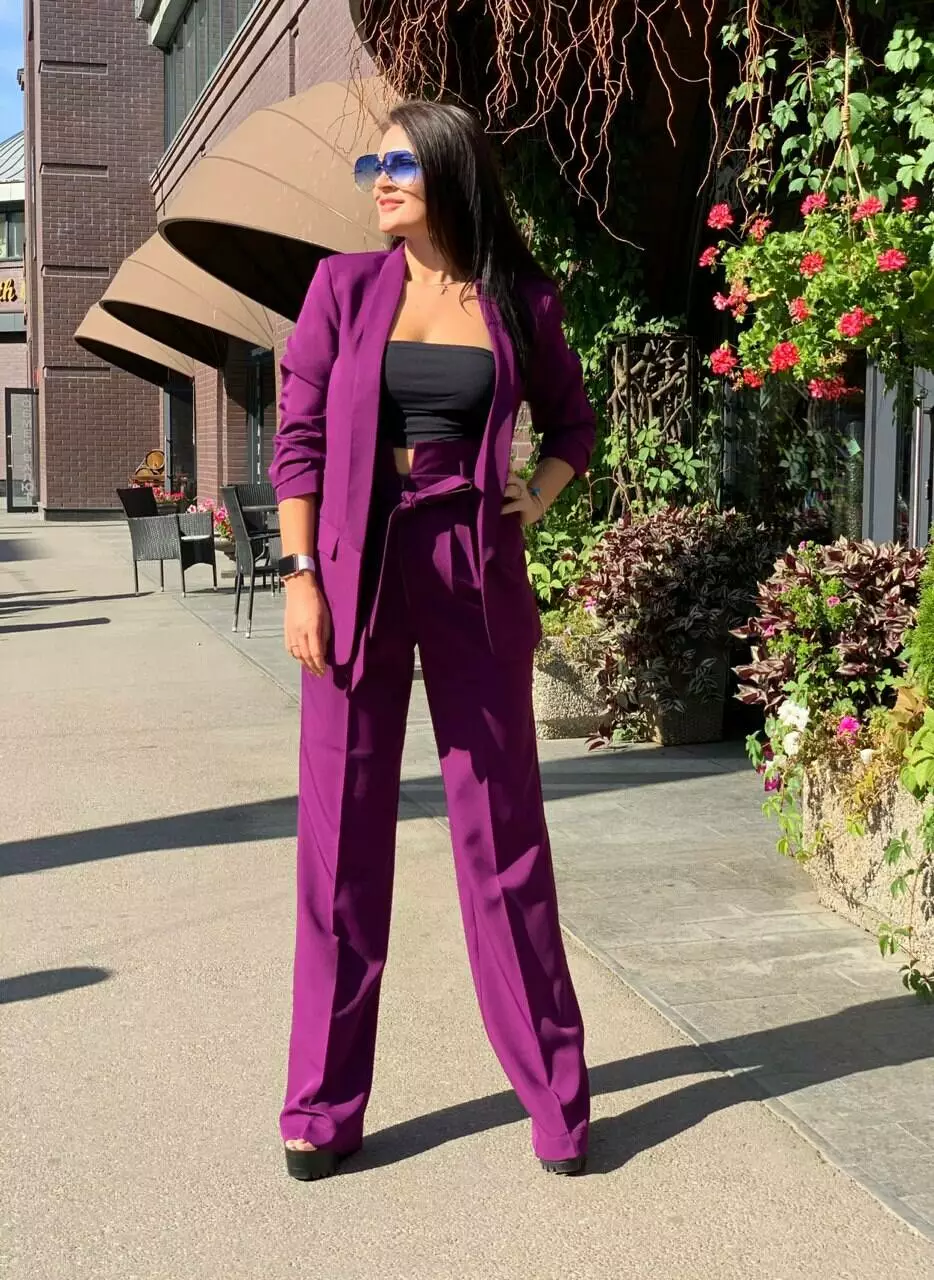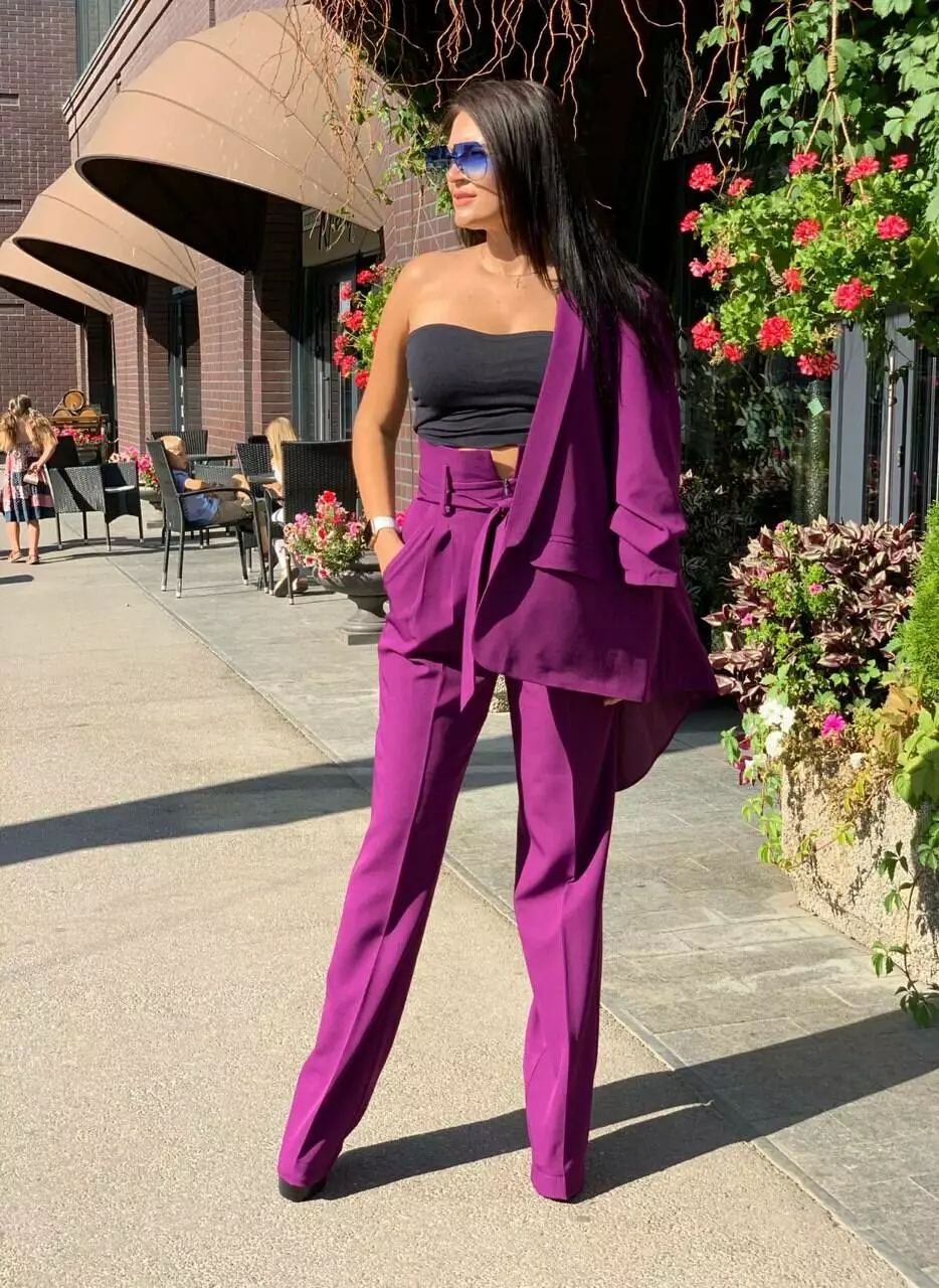 Стильний класичний костюм з тендовими штанами-трубами високої посадки та дуже ефектним піджаком з рукавами 3/4