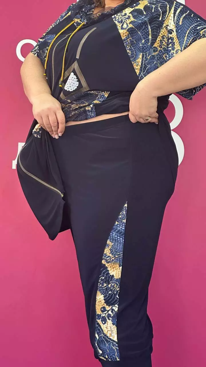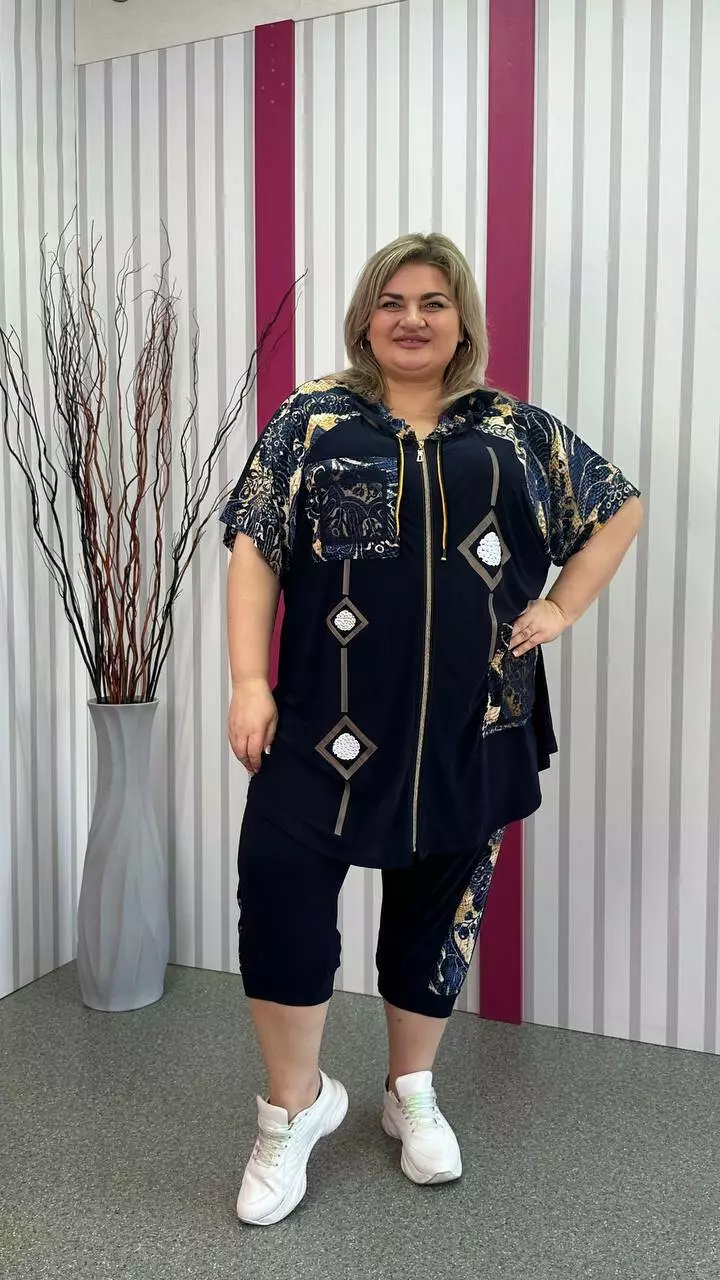 Костюм з капрі з корейської олії з дуже гарною розтяжністю. Тканина м'яка, легка, приємна до тіла, не меніться. Туніка на змійці зі спущеним плечем із капюшоном та кишенями. Прикрашена каменевим накатом та оздоблювальною тканиною зі срібним напиленням, яке не зітреться. Капрі широкі з високою посадкою, пояс на резинці.