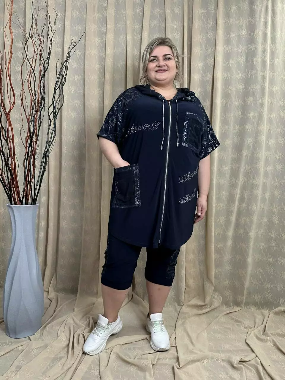 Костюм з капрі з корейської олії з дуже гарною розтяжністю. Тканина м'яка, легка, приємна до тіла, не меніться. Туніка на змійці зі спущеним плечем із капюшоном та кишенями. Прикрашена каменевим накатом та оздоблювальною тканиною зі срібним напиленням, яке не зітреться. Капрі широкі з високою посадкою, пояс на резинці.