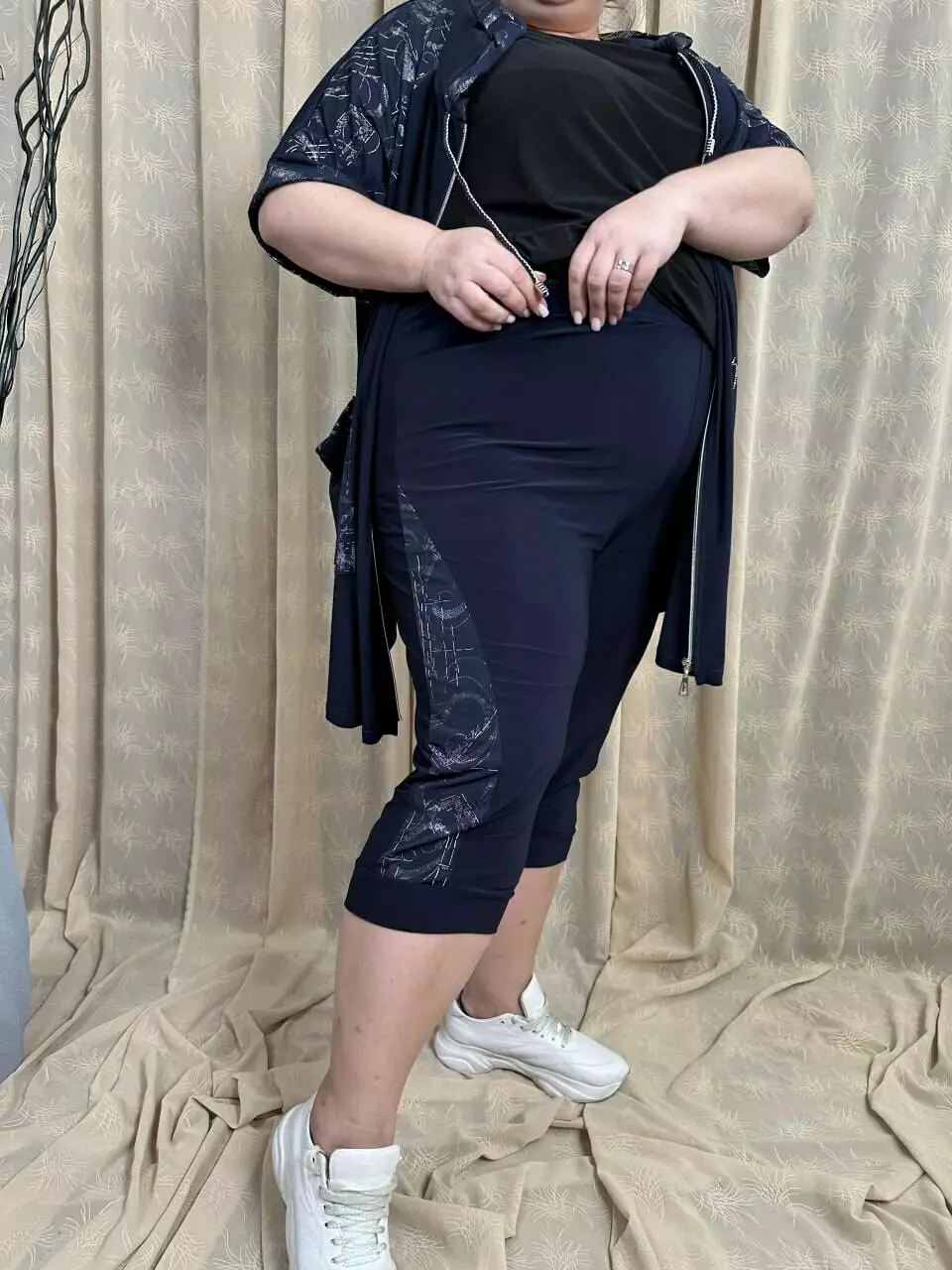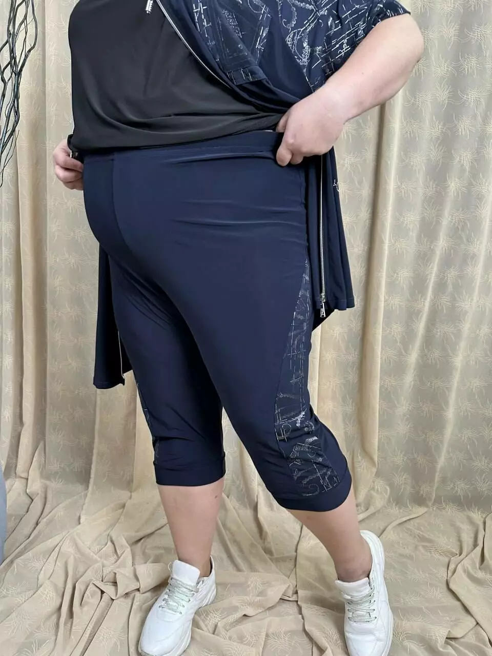 Капрі: Об'єм талії 100-150; Об'єм стегон 120-150; Довжина виробу 80; Внутрішній шов 44; ширина ноги 70; Ширина коліна 52; Ширина низу 40-44; Шов сидіння 80-88.