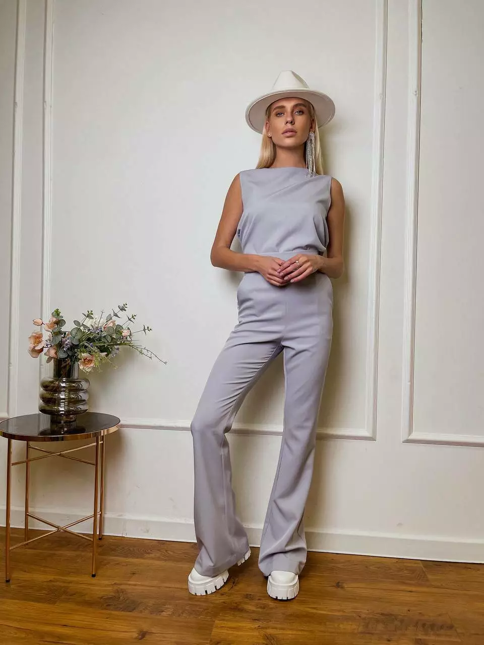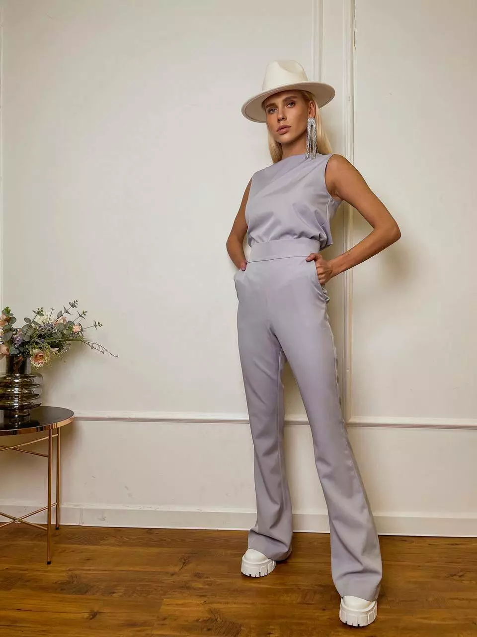 Однотонний комплект LOLA - це ідеальний варіант для стильного та модного вигляду Мінімалістичний та оригінальний костюм складається із топа, який має ідеальну посадку по грудях та вільний в талії, без кишень та застібок Штани мають високу посадку, яка ідеально підкреслить фігуру та клеш від коліна, бічні робочі кишені, застібаються штани на потайну блискавку позаду.