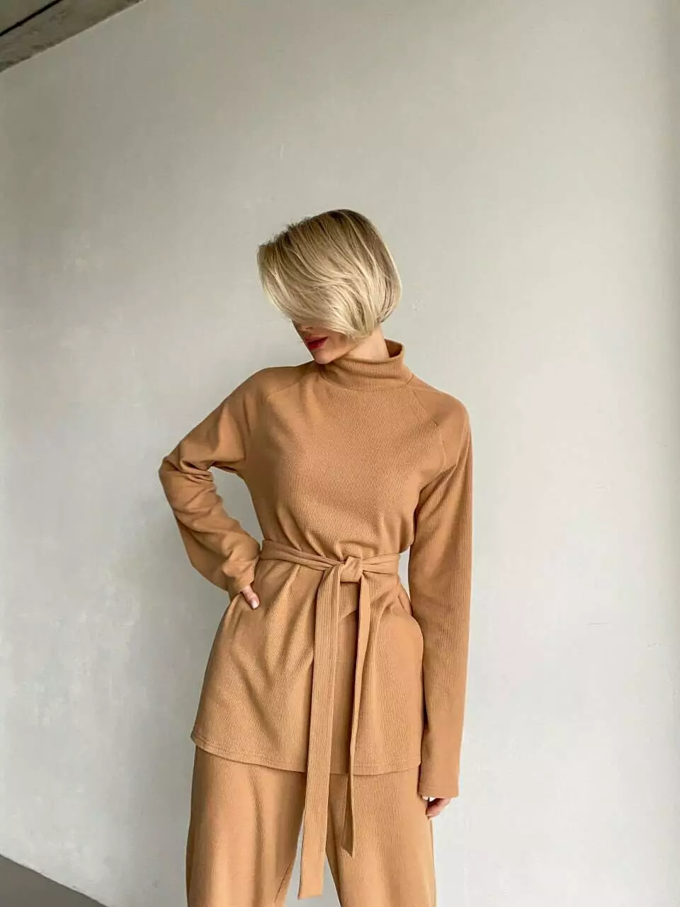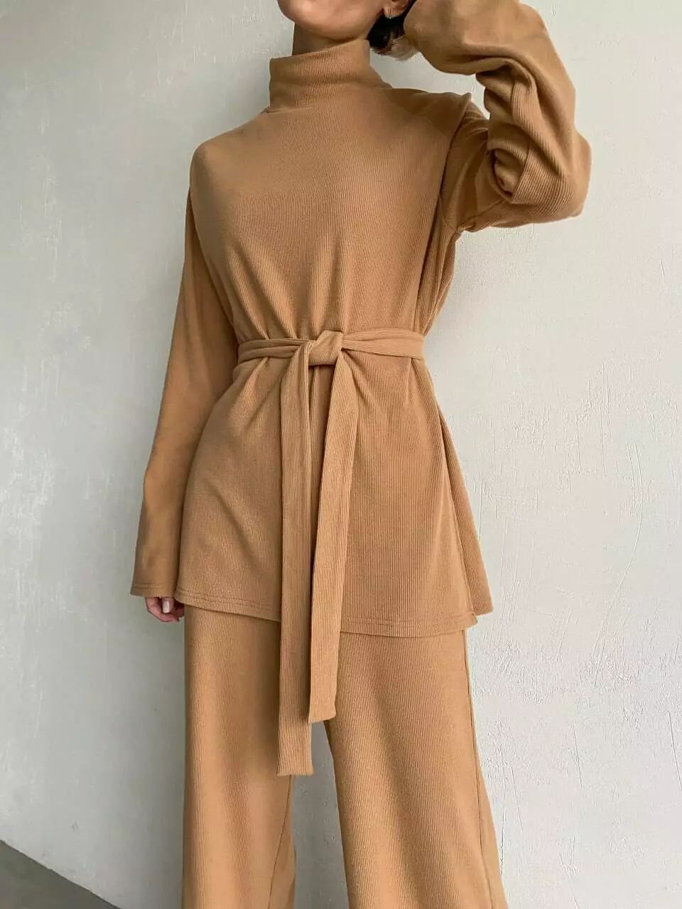 Виріб має пояс в тон, штани високої посадки та прямого крою на еластичній гумці, кофта з горлом, широка, з двома розрізами з боків