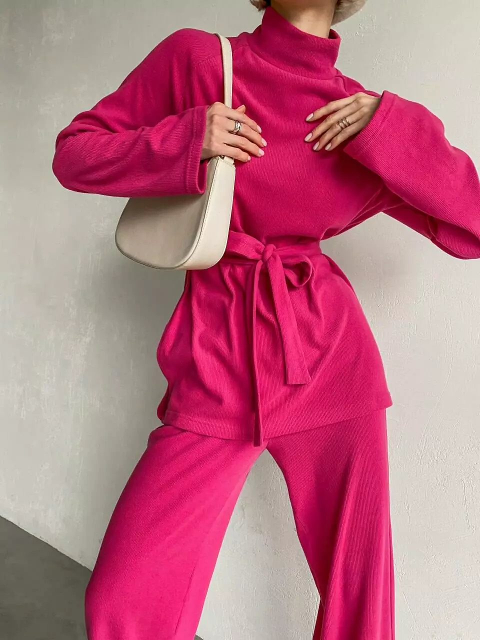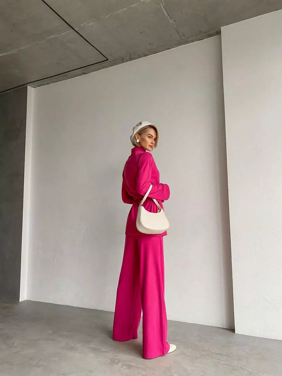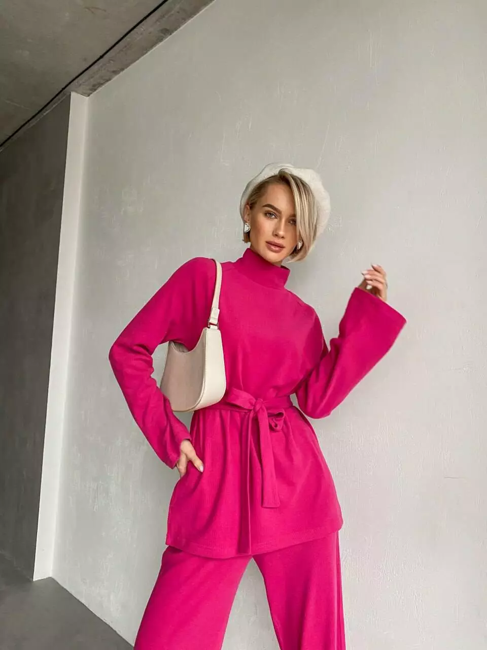 Виріб має пояс в тон, штани високої посадки та прямого крою на еластичній гумці, кофта з горлом, широка, з двома розрізами з боків