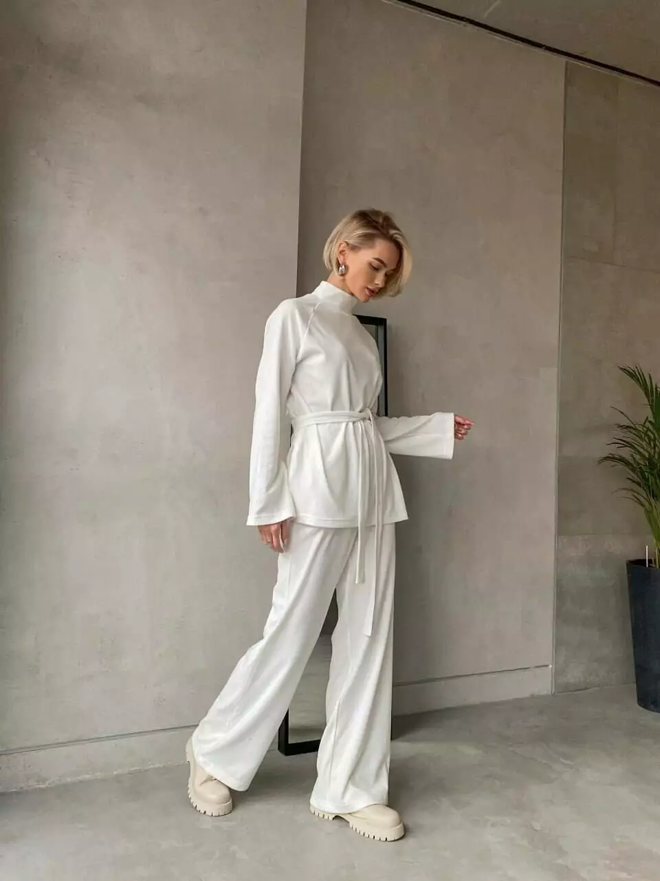 Виріб має пояс в тон, штани високої посадки та прямого крою на еластичній гумці, кофта з горлом, широка, з двома розрізами з боків