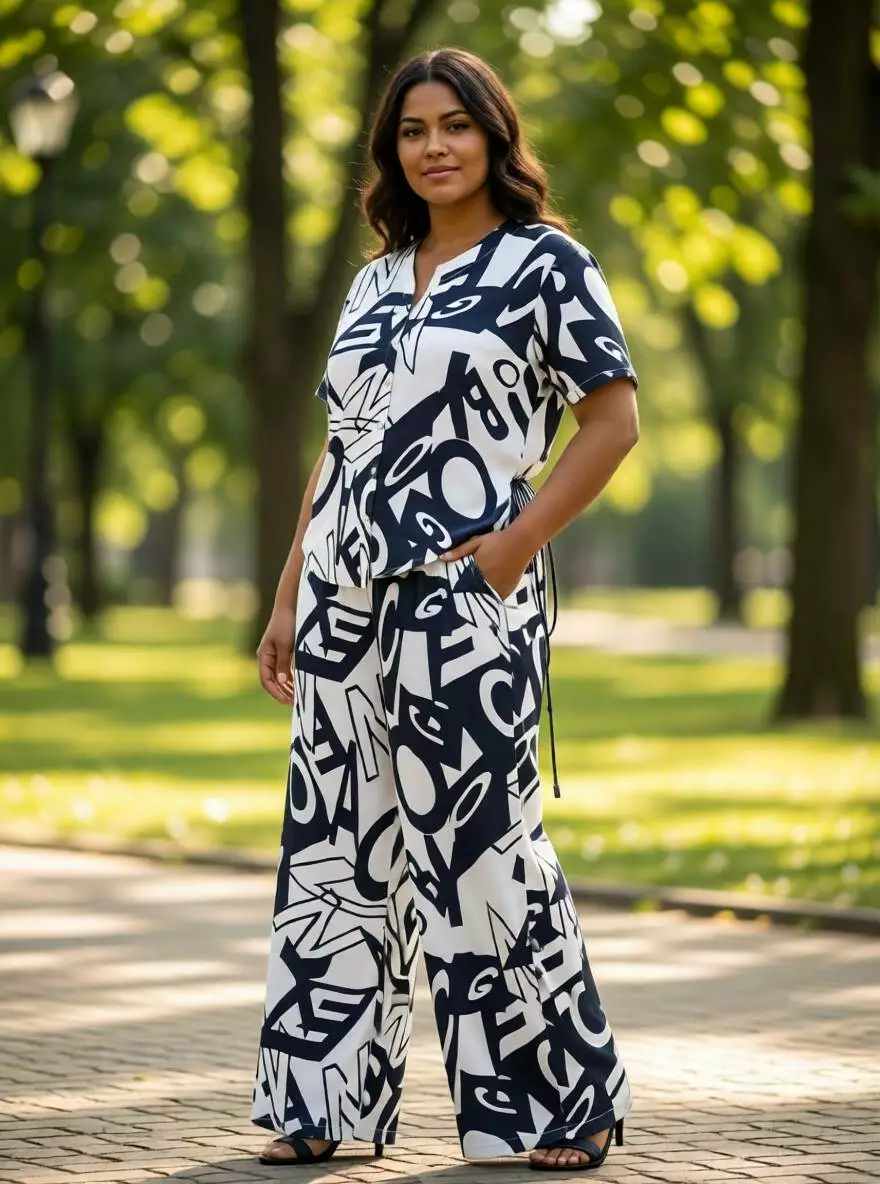 Цей костюм — втілення впевненості та стилю. Контрастний буквений принт у глибокому темно-синьому (майже чорному) кольорі на білому фоні створює чіткий, динамічний силует. Вільна сорочка та широкі штани палаццо візуально витягують фігуру, додаючи образу легкості та грації. Ідеальний вибір для тих, хто цінує стриману розкіш у повсякденному гардеробі.