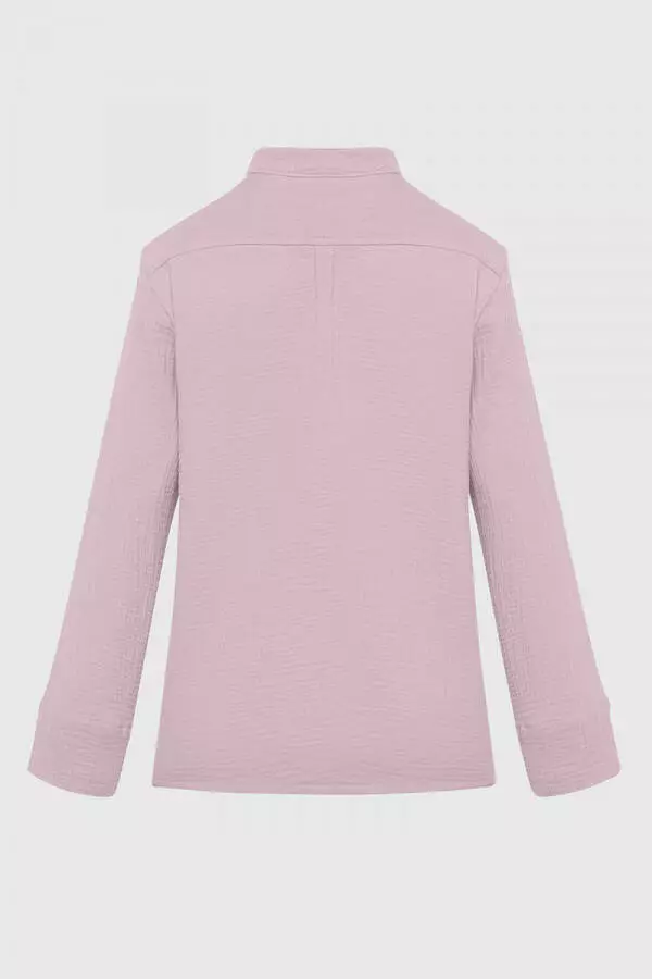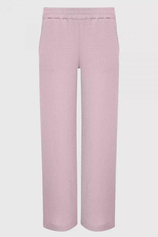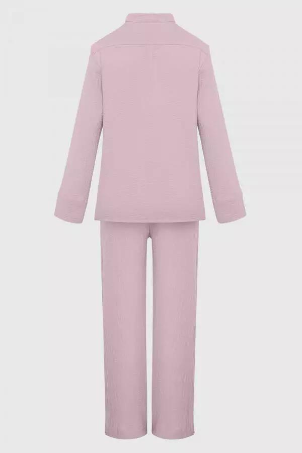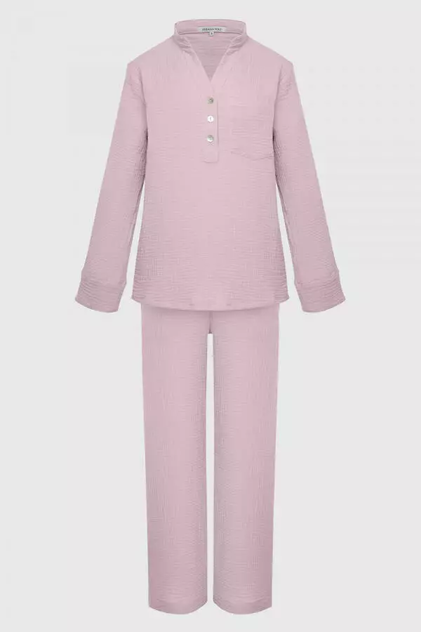 Якщо ви в пошуках ідеального домашнього одягу, то цей ніжний бузковий костюм найкращий варіант. Дуже комфортна модель, виконана з якісної тканини мусоліну, склад тканини 100% бавовна, яка приємно прилягає до тіла і дарує відчуй домашнього затишку. Натуральне бавовняне полотно не подразнює шкіру, не викликає алергію, добре вбирає вологу та пропускає повітря. Цей костюм є універсальним і доступний у всіх розмірах (s,m,l,xl). Сорочка з V-образним воротом, глибина якого регулюється за допомогою світлих ґудзиків, довгі широкі рукава з виділеним манжетом, також для вашої зручності з ліва є невеличка кишеня, для дрібних речей. Штани вільного крою на резинці,з двома кишенями по боках, та широкі з низу, в яких в почуваєтесь вільно і зручно. Сам костюм не сковує рухи, тому є дуже зручним в носінні, а бузковий колір підкреслить вашу жіночність і ніжність. Той самий комфортабельний варіант, який підійде кожному.