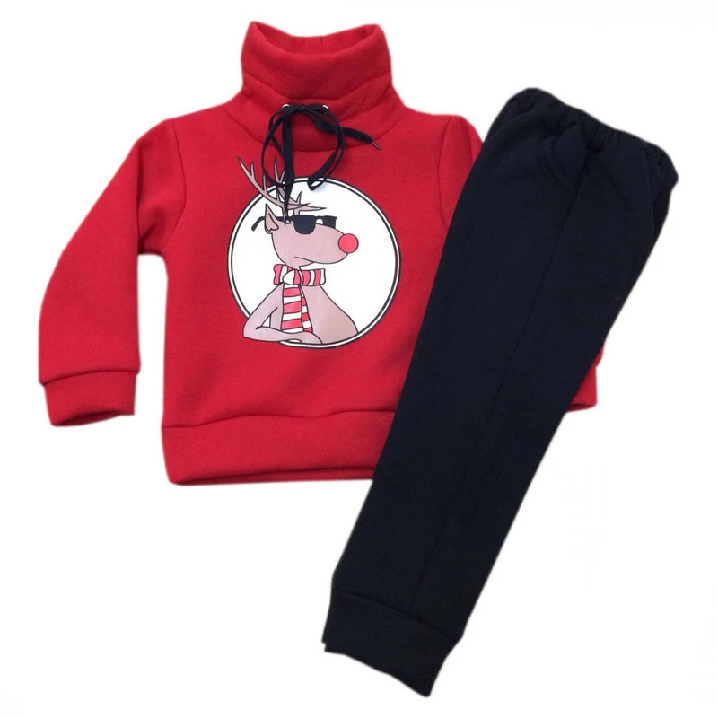 Утеплённый костюм, горловина высокая затягивается шнурком, штаны с карманами, кофта декорирована рисунком.