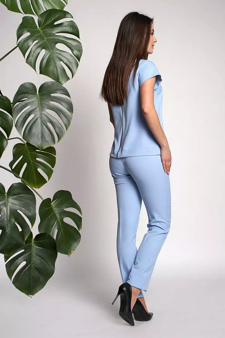 Стильный и современный костюм Нейл состоит из кофточки и брюк, выполнен из ткани креп-костюмка высокого качества. Кофточка прямого кроя с коротким рукавом, сзади по всей длине застегивается на золотистую молнию. Укороченные модные брючки со стрелкой, с высокой посадкой застегиваются на пуговицу и молнию. Такие брюки делают Вашу фигуру очень женственной, подчеркивают узкую талию и округлую линию бедер. Костюм очень модный и практичный.