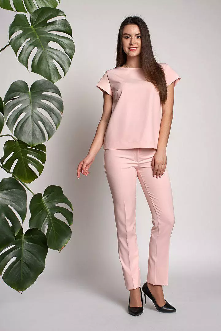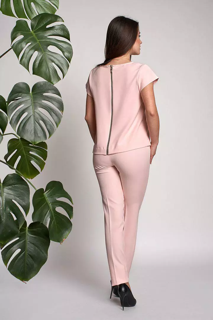 Стильный и современный костюм Нейл состоит из кофточки и брюк, выполнен из ткани креп-костюмка высокого качества. Кофточка прямого кроя с коротким рукавом, сзади по всей длине застегивается на золотистую молнию. Укороченные модные брючки со стрелкой, с высокой посадкой застегиваются на пуговицу и молнию. Такие брюки делают Вашу фигуру очень женственной, подчеркивают узкую талию и округлую линию бедер. Костюм очень модный и практичный.