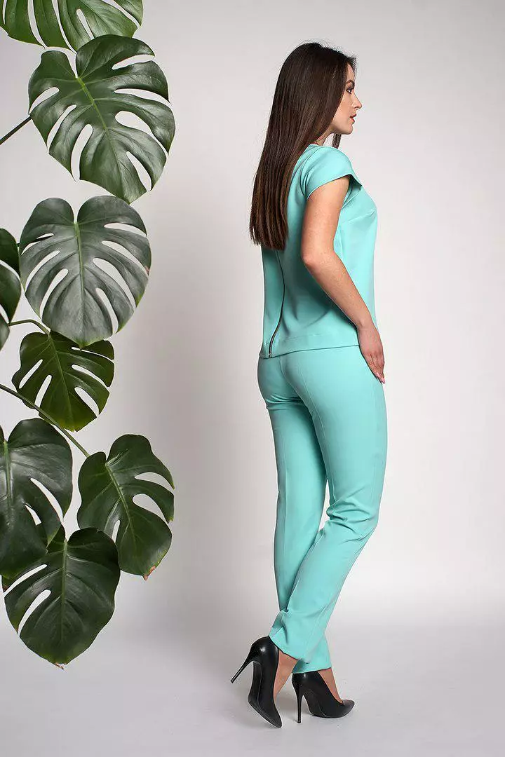 Стильный и современный костюм Нейл состоит из кофточки и брюк, выполнен из ткани креп-костюмка высокого качества. Кофточка прямого кроя с коротким рукавом, сзади по всей длине застегивается на золотистую молнию. Укороченные модные брючки со стрелкой, с высокой посадкой застегиваются на пуговицу и молнию. Такие брюки делают Вашу фигуру очень женственной, подчеркивают узкую талию и округлую линию бедер. Костюм очень модный и практичный.