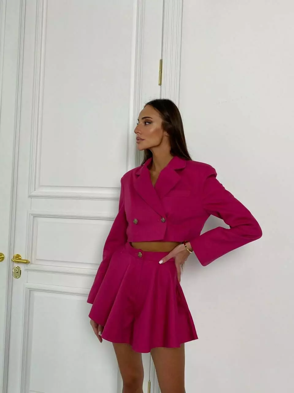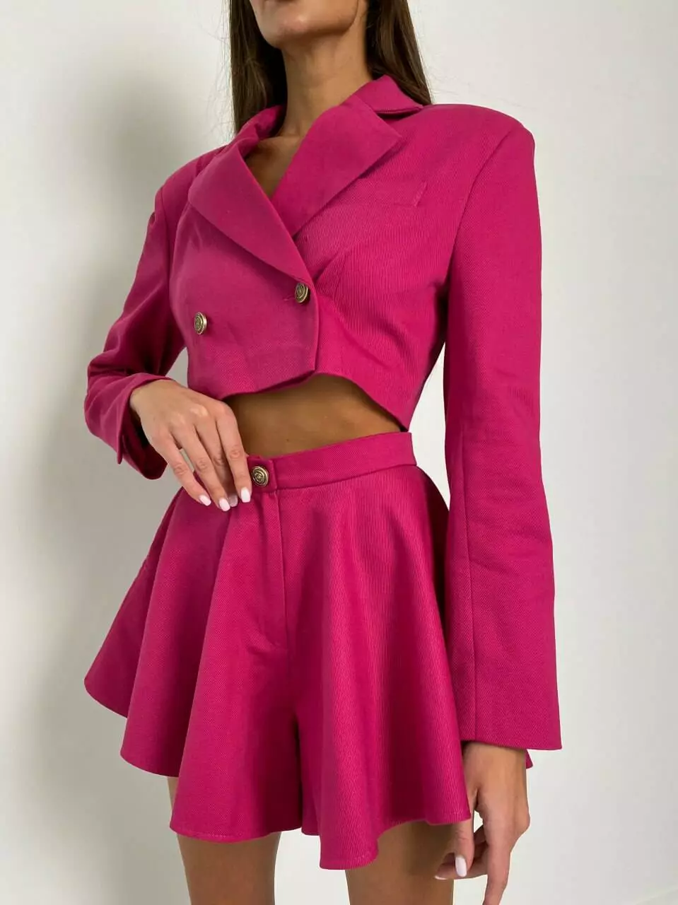 Котоновий костюм у люксовому виконанні Сексуальний та стильний, коктейльний Укорочений піджак з об'ємними плечима та шорти спідниця з кишенями