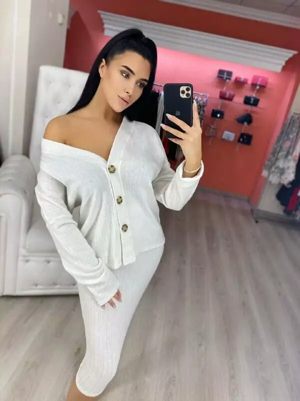 Трикотажний костюм, спідниця міді та кофта під пояс.