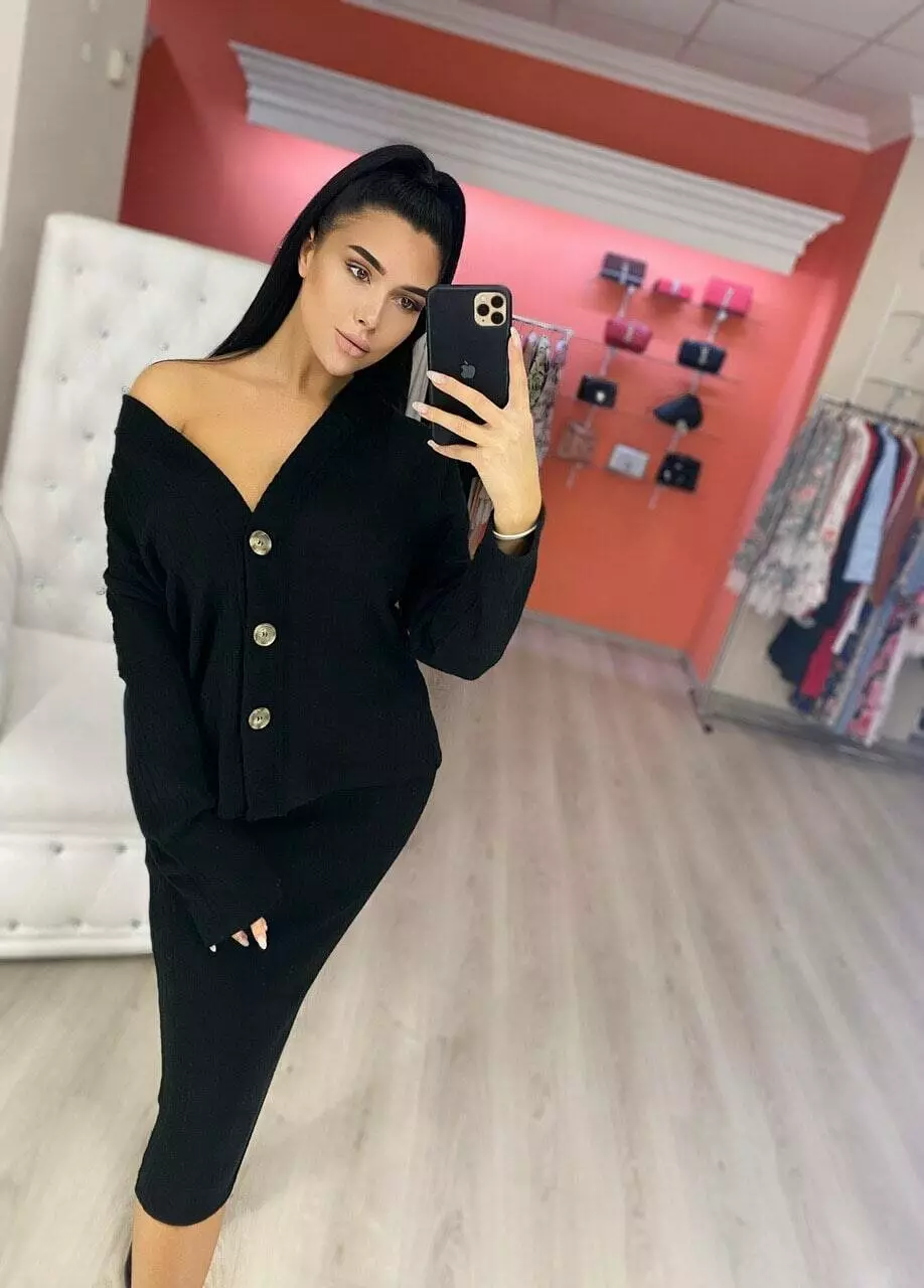 Трикотажний костюм, спідниця міді та кофта під пояс.