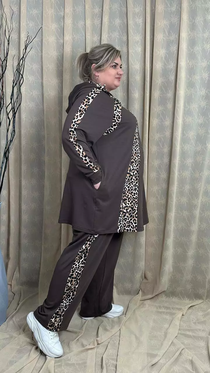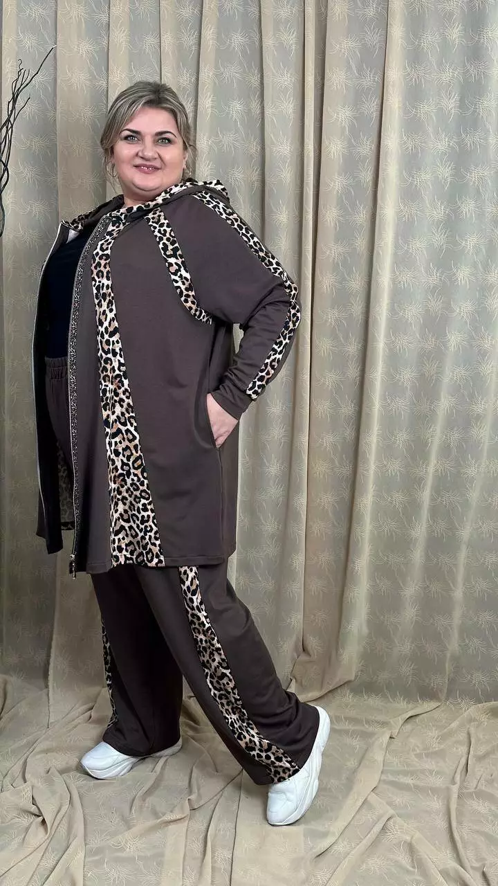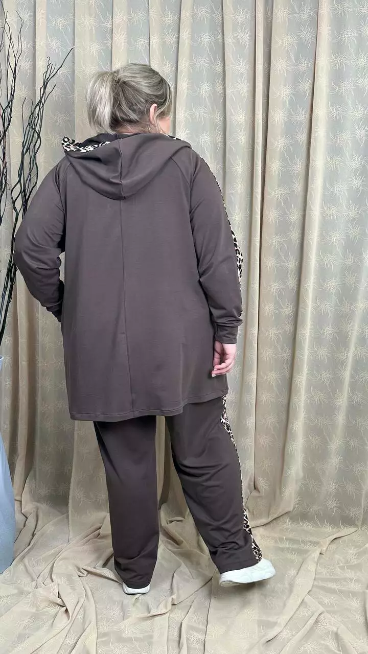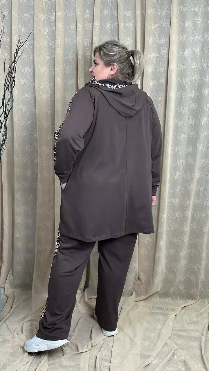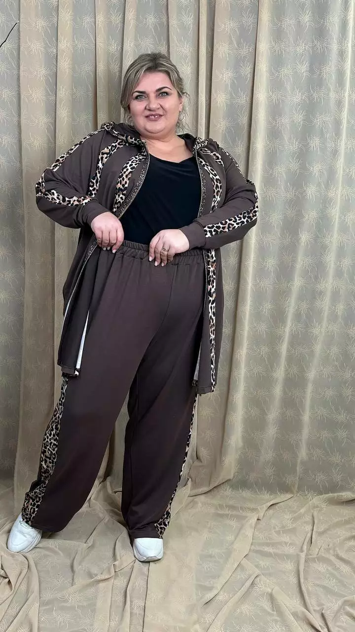 Костюм із трикотажу двонитка, відмінної якості. Кофта клешена донизу, рукав реглан, кишені в бічних швах. Штани вільні з лампасами, без кишень, висока посадка, пояс на гумці.